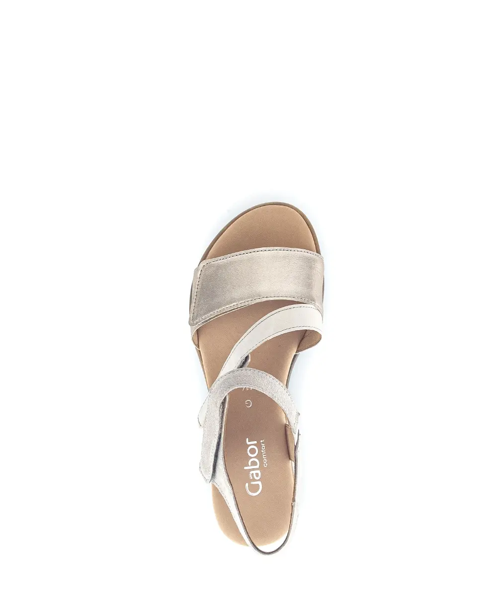 Ontdek de perfecte combinatie van stijl en comfort met de Gabor platina sandalen. Deze elegante schoenen zijn vervaardigd met een metallic accent die jouw voeten laten stralen bij elke stap. De platina tint voegt een vleugje luxe toe aan je outfit. Met een klittenband sluiting, bieden deze sandalen een optimale pasvorm die zich aanpast aan jouw voet. De sleehak met kurk accent zorgt voor een elegante lift en een zelfverzekerde uitstraling, zonder in te boeten aan draagcomfort.