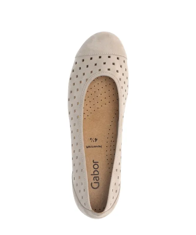 Kies voor tijdloze elegantie met deze klassieke beige Gabor ballerina's van nubuck. De subtiele gaatjes in de stof zorgen voor een verfijnde uitstraling en optimale ventilatie. Perfect voor elke gelegenheid en ontworpen met een comfortabele F wijdte en hovercraft technologie. Gun jezelf het comfort dat je verdient.