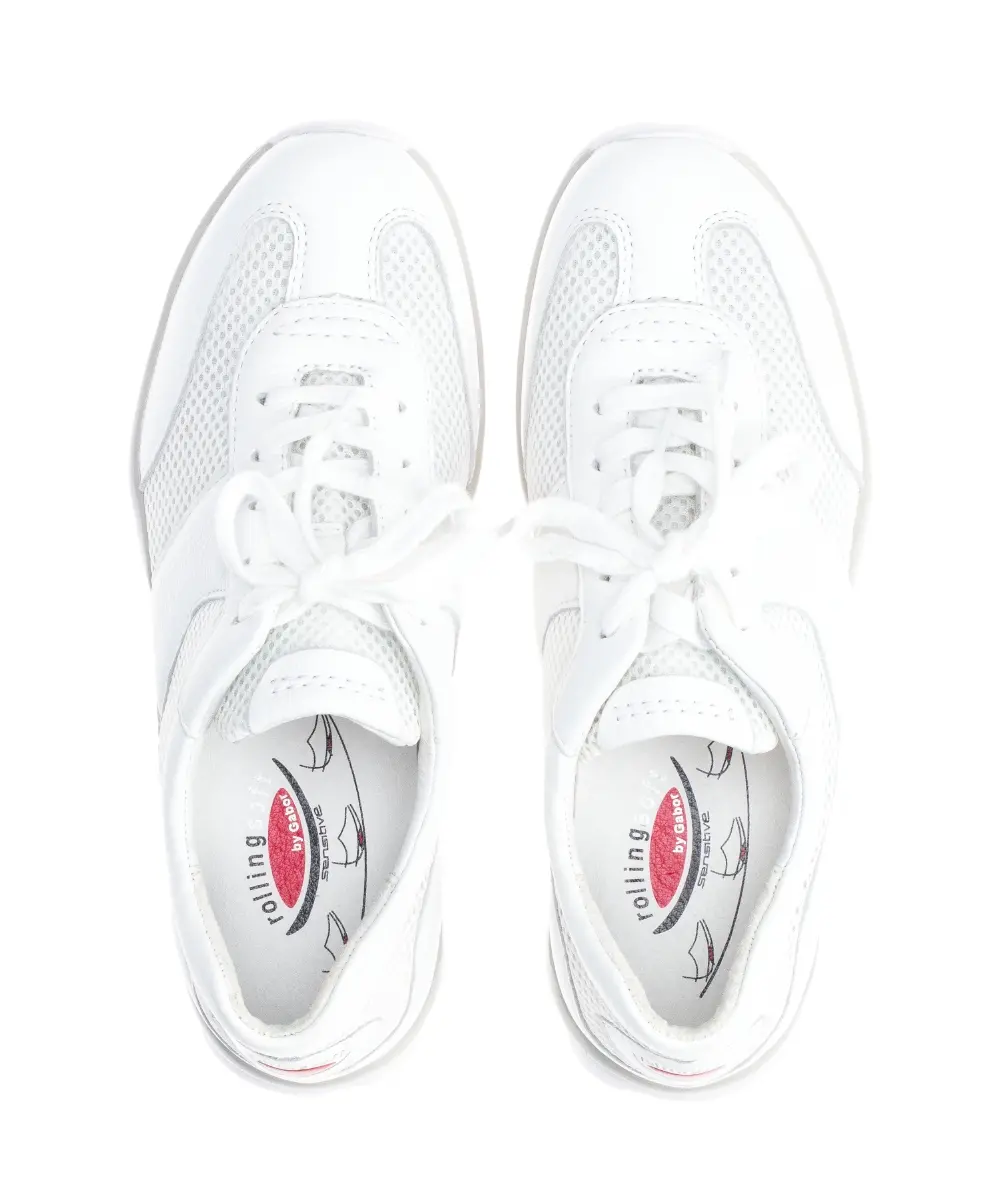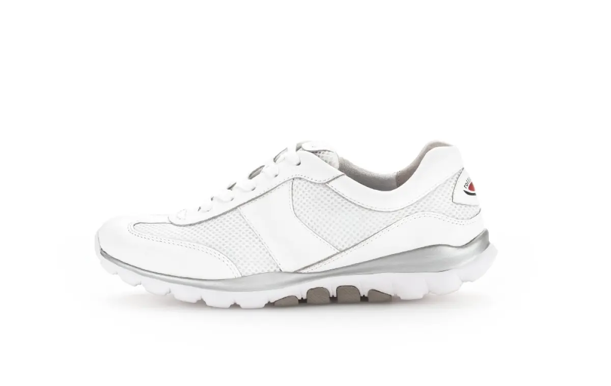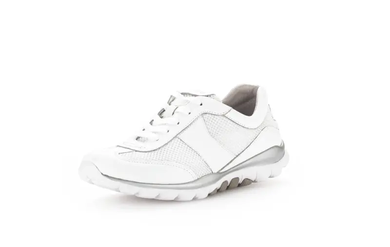 Gun jezelf het comfort van de Gabor Rollingsoft sneaker, vervaardigd uit soepel wit nappaleer met een opvallende zilveren zool. Deze tijdloze schoen biedt naast stijl ook een optimale pasvorm dankzij de G wijdte. De mesh materialen zorgen voor ademend vermogen, terwijl de veters een perfecte sluiting garanderen. Stap moeiteloos elke uitdaging tegemoet met deze klassieke keuze aan je voeten.