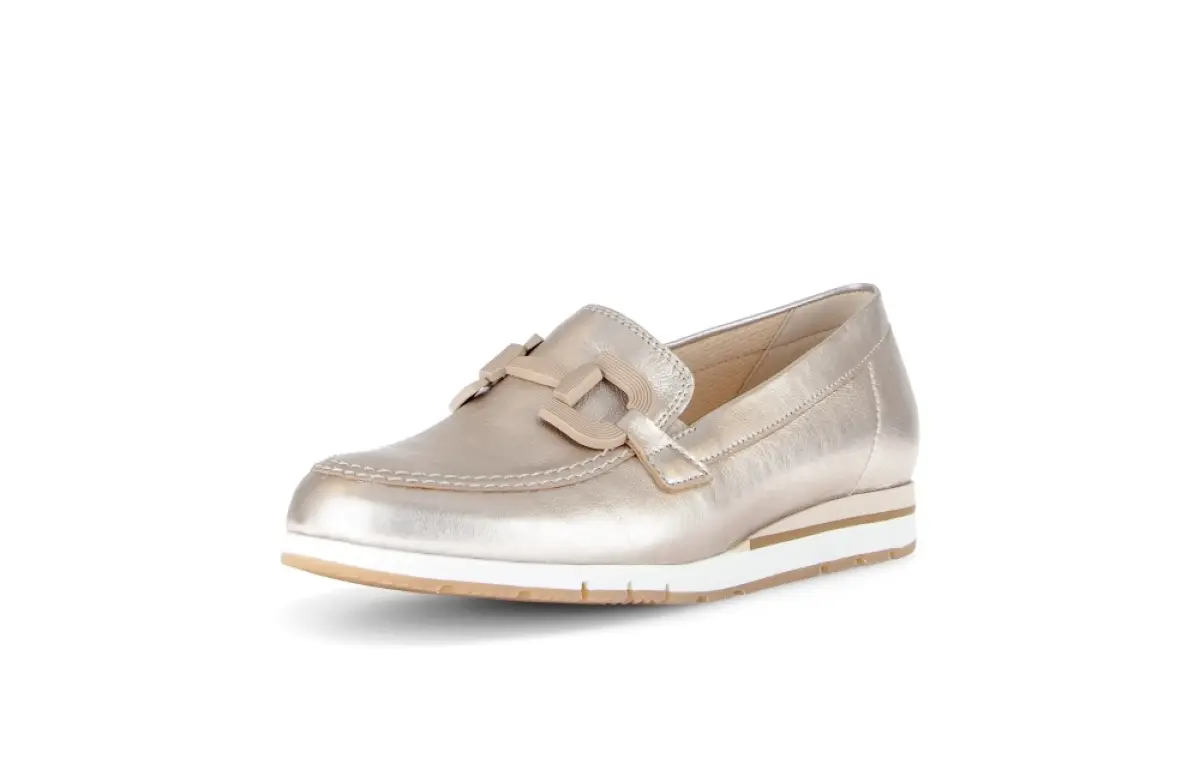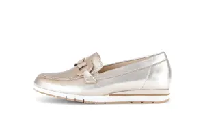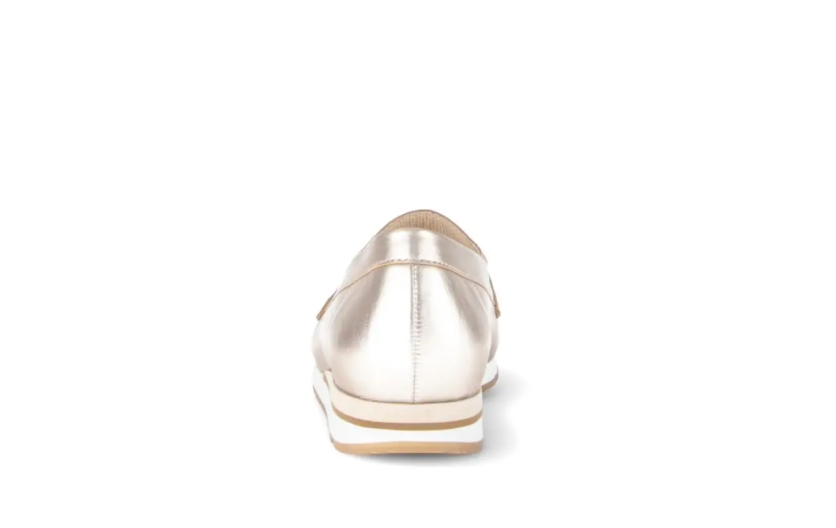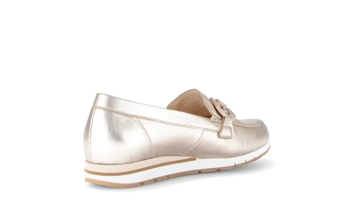 Deze elegante instapper van Gabor in zacht goudkleurig nappaleer combineert tijdloze klasse met modern comfort. Het soepele leer voelt aangenaam aan en vormt zich moeiteloos naar de voet, terwijl het losse voetbed zorgt voor optimale ondersteuning en eenvoudig te vervangen is door eigen inlegzolen. De subtiele glans van het goud geeft deze mocassin een luxueuze uitstraling, perfect voor zowel casual als geklede gelegenheden. De lichte zool met een zachte demping biedt extra loopcomfort en een moderne twist. Dankzij de wijdte G is er voldoende ruimte voor de voet, wat de pasvorm nog comfortabeler maakt.