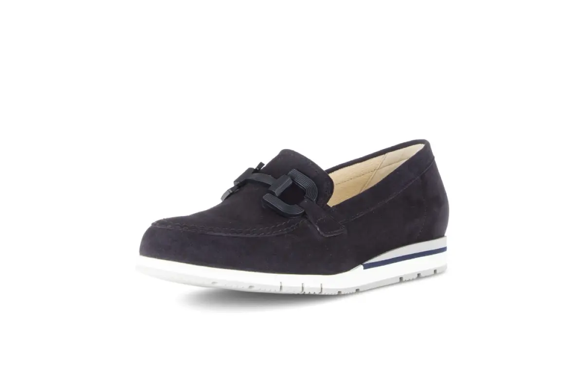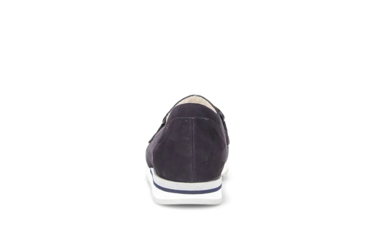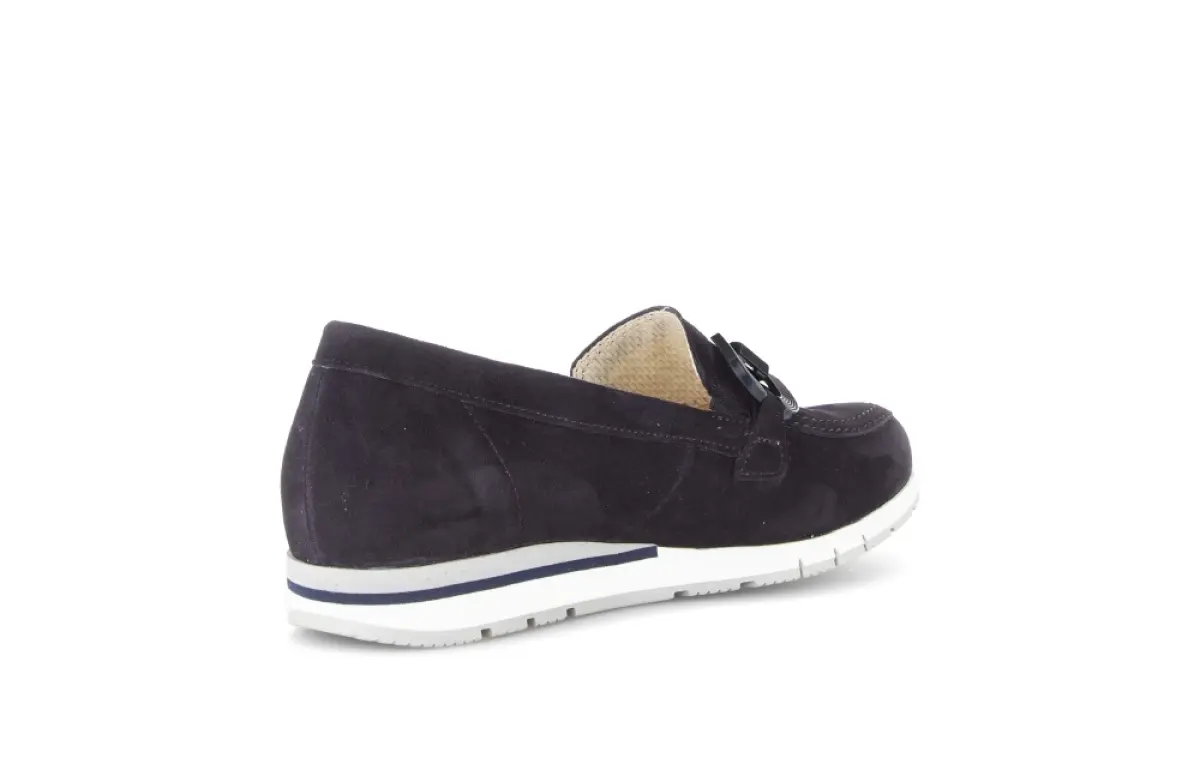 Deze stijlvolle Gabor loafer van nachtblauw suède biedt de perfecte combinatie van elegantie en dagelijks comfort. Het zachte suède voelt luxueus aan en geeft de schoen een verfijnde uitstraling, terwijl de diepe blauwtint zorgt voor een tijdloze en veelzijdige look. De decoratieve gesp op de wreef voegt een subtiel accent toe en maakt het ontwerp modern en chic. Dankzij de wijdte G biedt deze instapper extra ruimte en draagcomfort, ook bij een iets bredere voet. Het losse voetbed zorgt voor optimale ondersteuning en kan eenvoudig worden vervangen door eigen inlegzolen. Bestel deze stijlvolle instapper vandaag nog eenvoudig via onze webshop.