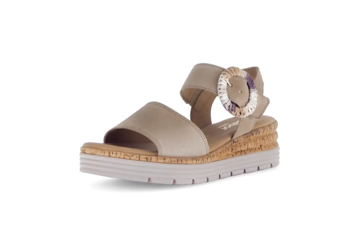 Deze beige suède sandalen van Gabor combineren tijdloze elegantie met zomers comfort. Het zachte suède geeft een luxe uitstraling, terwijl de grote decoratieve gesp in natuurlijke tinten met subtiele metallic accenten een speelse twist toevoegt. De sleehak met kurkdetails en de lichte zool bieden een trendy en comfortabele basis, ideaal voor dagelijks gebruik of speciale gelegenheden.
