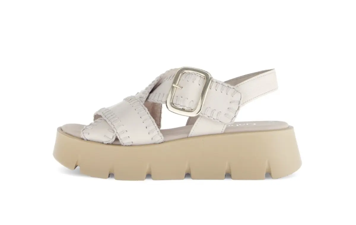 Voor een stijlvolle en comfortabele zomer kies je deze beige nappaleren sandalen van Gabor. De gekruiste bandjes met decoratieve stiksels en een subtiele gouden gesp zorgen voor een unieke, handgemaakte uitstraling. De dikke zool in natuurlijke tint biedt een moderne look en uitstekende ondersteuning, ideaal voor lange zomerdagen.
