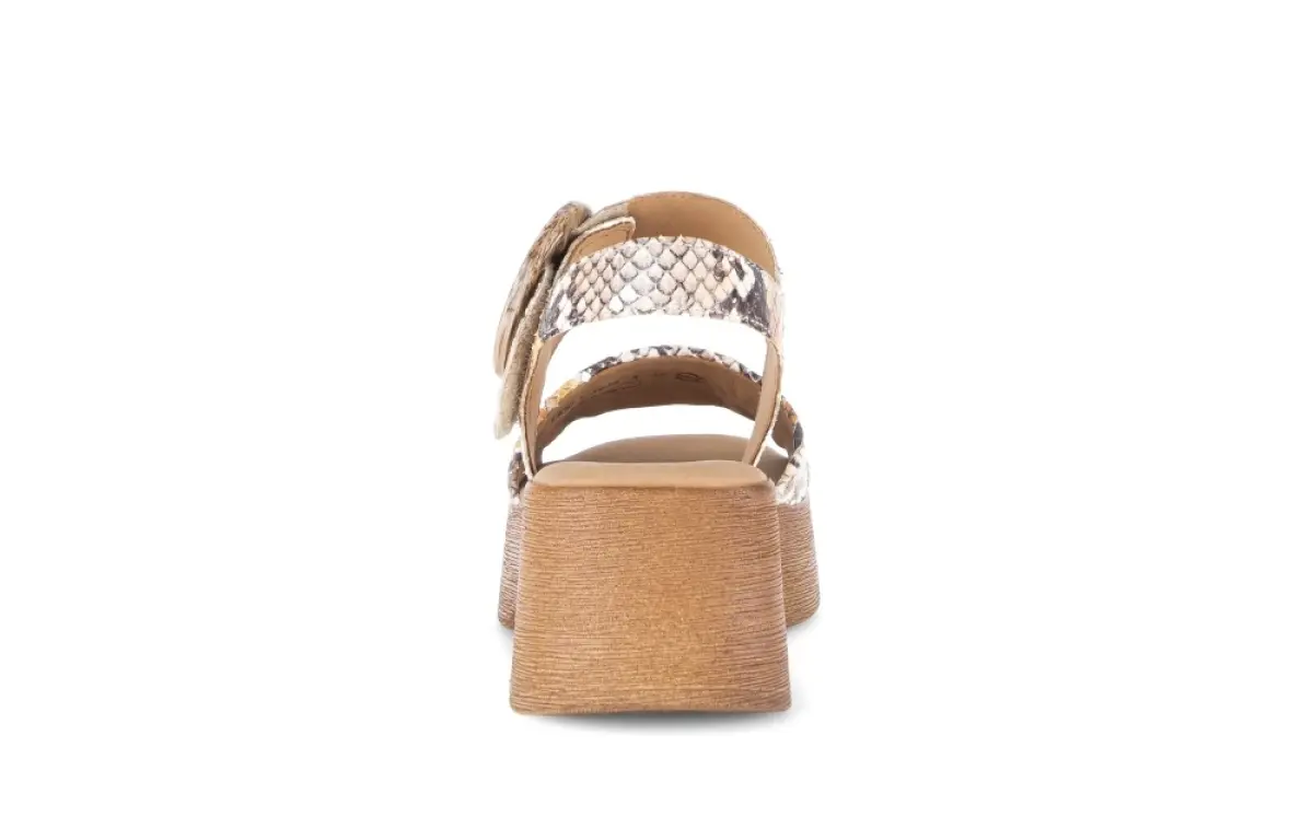 Deze opvallende Gabor sandaal met beige slangenprint is een echte blikvanger voor het zomerseizoen. De luxueuze print in warme tinten geeft de schoen een modieuze en speelse uitstraling, terwijl het brede bandje over de wreef zorgt voor een stevige, comfortabele pasvorm. De grote, ronde gesp vormt een stijlvol detail dat perfect aansluit bij de natuurlijke kleurtonen van het design. Dankzij de Best Fitting wijdte F ervaar je extra comfort bij de voorvoet, en het vaste voetbed biedt ondersteuning en demping bij elke stap. De lichte plateauzool met subtiel houtlook-effect geeft de sandaal niet alleen een moderne uitstraling, maar ook extra stabiliteit en loopgemak.