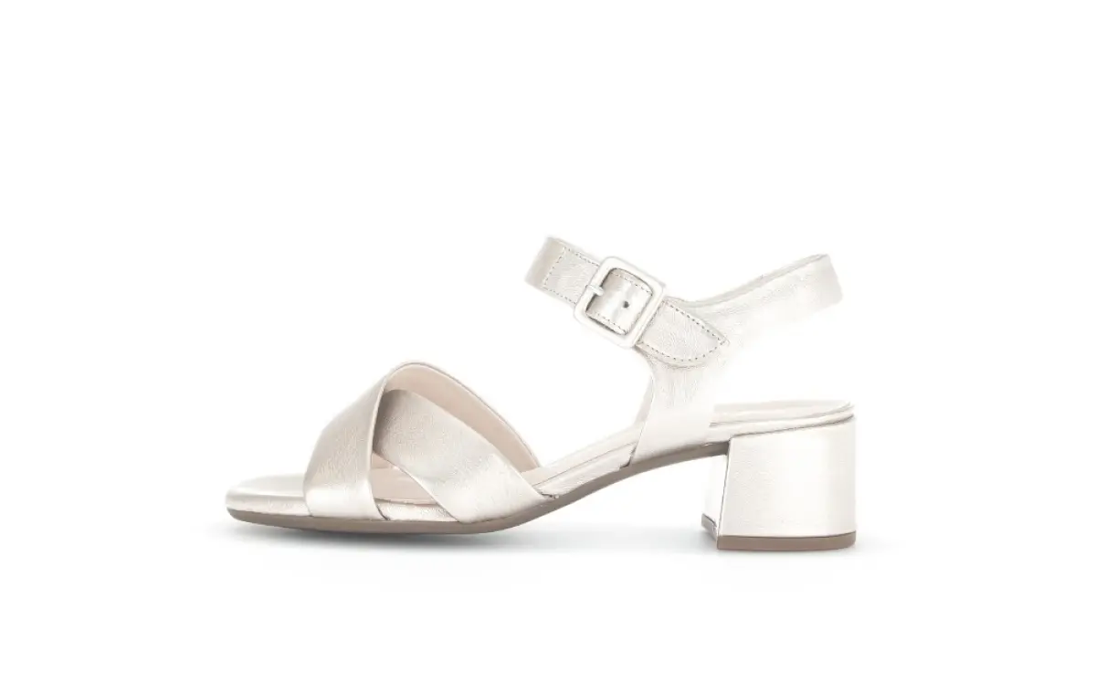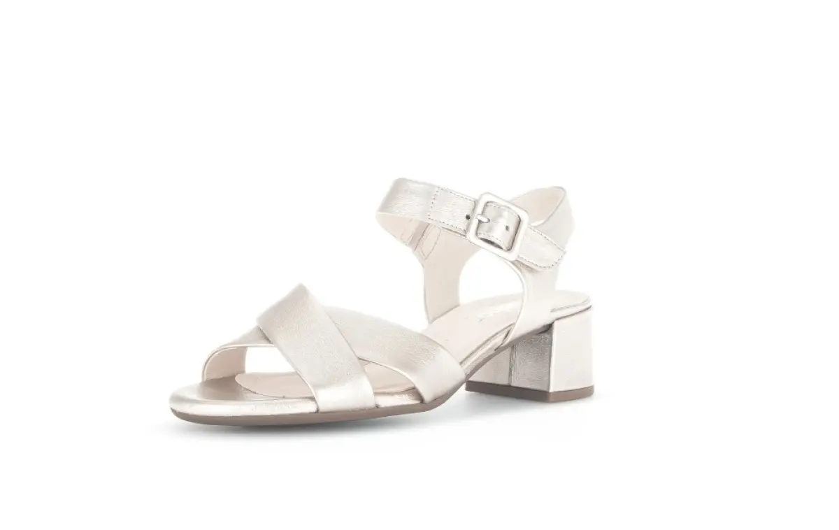 Deze elegante Gabor sandaal in zacht goud straalt tijdloze klasse uit. De subtiele glans van het hoogwaardige leer geeft een verfijnde uitstraling, terwijl de gekruiste bandjes de voet sierlijk omsluiten. Het verstelbare bandje, voorzien van klittenband, zorgt voor een perfecte pasvorm en de blokhak biedt stabiliteit en comfort, ideaal voor lange zomerdagen of een chique avondje uit. De lichte zool met demping maakt elke stap moeiteloos en comfortabel. Draag deze veelzijdige sandaal met een zwierige jurk voor een feestelijke look of combineer met een linnen broek voor een elegante, casual stijl.