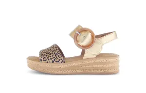 Laat je stijl opvallen met deze opvallende gouden sandalen van Gabor! De voorste band in nubuck met een trendy luipaardprint geeft deze sandalen een speelse en gedurfde uitstraling. De grote ronde gesp in warme tinten biedt een elegant accent en zorgt voor een perfecte pasvorm. De gevlochten sleehakzool geeft een zomerse vibe en biedt comfort en stabiliteit gedurende de dag.