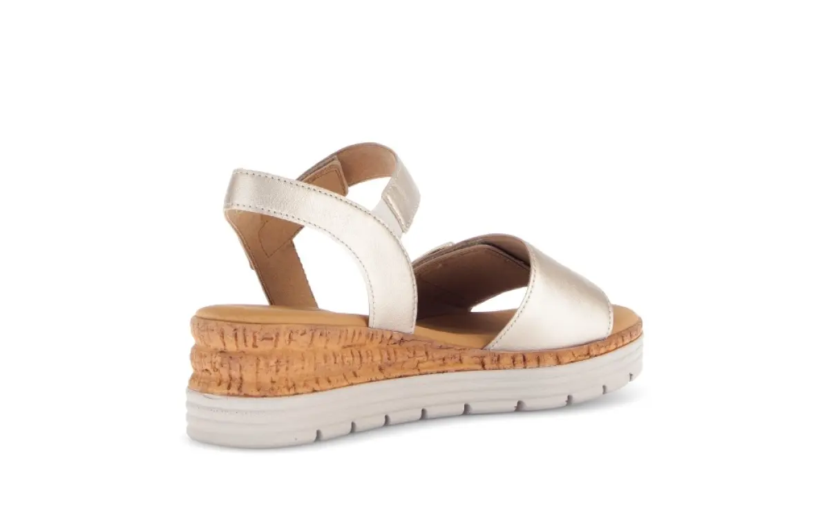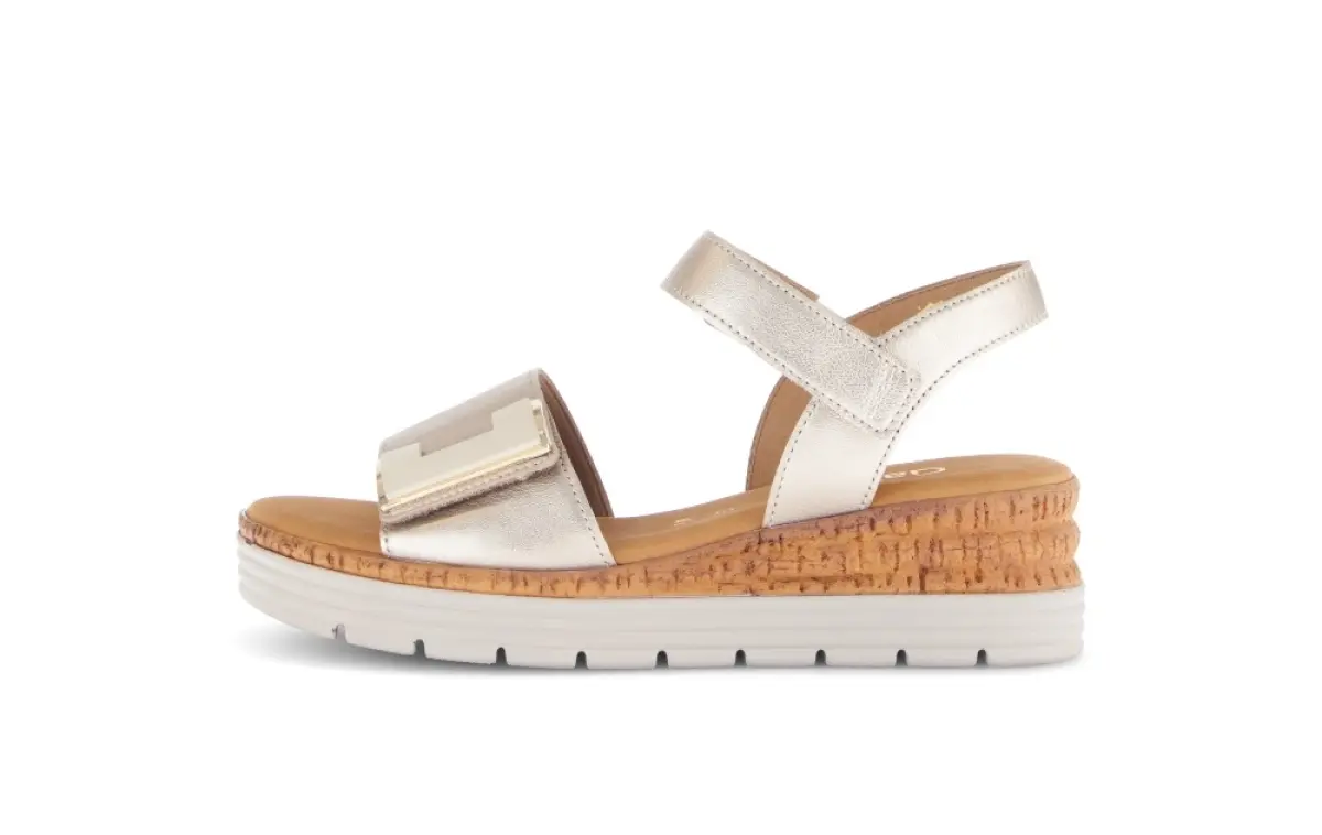 Deze elegante Gabor sandaal van goud nappaleer combineert stijl, comfort en kwaliteit op een verfijnde manier. Het soepele leer voelt zacht aan op de huid en zorgt voor een luxueuze uitstraling, terwijl de glanzende goudtint een zomerse en chique touch toevoegt aan elke outfit. Dankzij de wijdte G biedt deze sandaal extra loopruimte, waardoor jouw voeten ook op warme dagen ontspannen kunnen blijven. De kurklook zool met lichte onderzool geeft de sandaal een moderne en luchtige uitstraling, ideaal voor zowel casual als geklede gelegenheden. De brede band met stijlvolle gesp aan de voorzijde maakt het ontwerp compleet en zorgt voor een subtiel accent. Deze gouden Gabor sandaal is een veelzijdige keuze die elegantie en draagcomfort moeiteloos combineert.