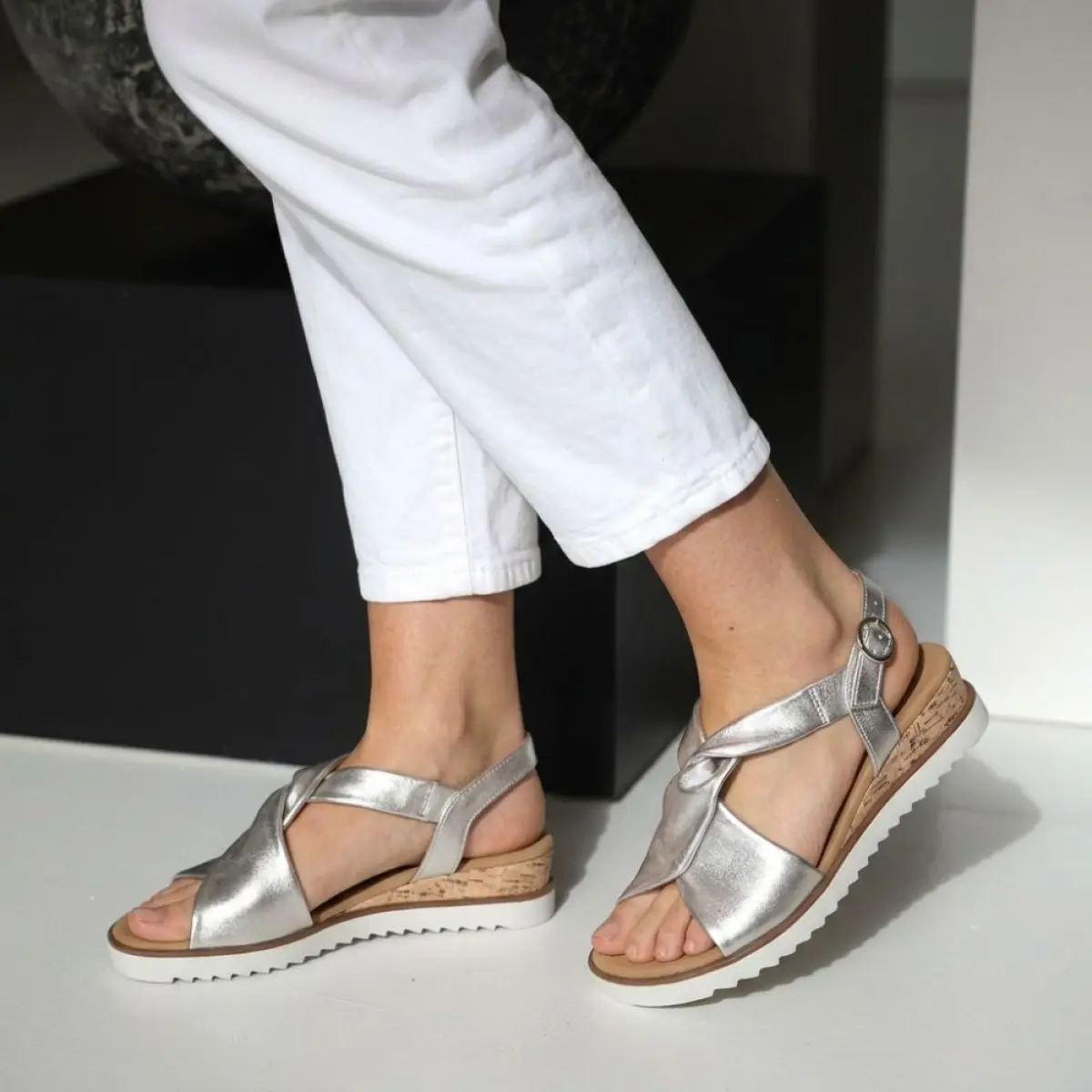 Deze goudkleurige Gabor sandaal van zacht nappaleer voelt meteen comfortabel aan zodra je instapt. De soepel gekruiste banden sluiten mooi aan op je voet en geven de sandaal een elegante, zomerse uitstraling. Het vaste voetbed biedt prettige ondersteuning tijdens lange dagen, terwijl de lichte sleehak van kurk je look een subtiel liftend effect geeft zonder in te leveren op gemak. Dankzij wijdte G ervaar je net wat meer ruimte, wat prettig is bij warm weer of wanneer je voeten uitzetten. De goudtint laat zich makkelijk combineren met luchtige jurken, linnen broeken of een casual jeans en geeft elke outfit een frisse, chique glans.
