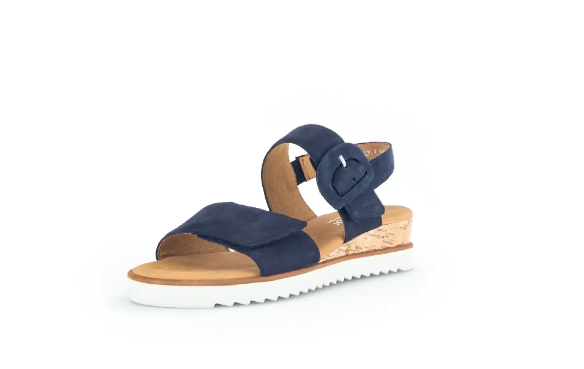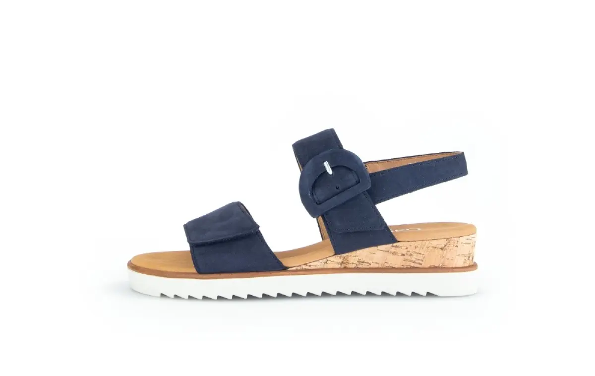 Deze stijlvolle sandaal van nachtblauw nubuck van Gabor is de perfecte combinatie van comfort en elegantie. De brede banden van zacht nubuck voelen aangenaam aan op de huid en geven de schoen een verfijnde, moderne uitstraling. De opvallende gesp voegt een speels accent toe, terwijl het vaste voetbed zorgt voor langdurig draagcomfort. Dankzij de wijdte G biedt deze sandaal extra ruimte voor een ontspannen pasvorm. De kurklook zool met lichte sleehak geeft een natuurlijke, zomerse look en biedt bovendien fijne demping bij elke stap.Combineer deze nachtblauwe sandaal moeiteloos met een luchtige zomerjurk of een linnen broek voor een stijlvolle en comfortabele outfit op warme dagen.