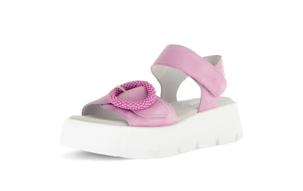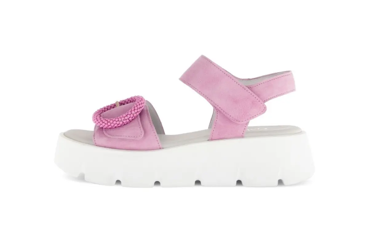 Voeg een speelse touch toe aan je zomergarderobe met deze roze suède sandalen van Gabor! De opvallende kraalversiering op de bandjes geeft een unieke en vrolijke uitstraling. Dankzij de verstelbare klittenbandsluiting geniet je van een perfecte pasvorm en ultiem gemak. De witte chunky zool zorgt voor een trendy look en biedt uitstekende ondersteuning tijdens het lopen.