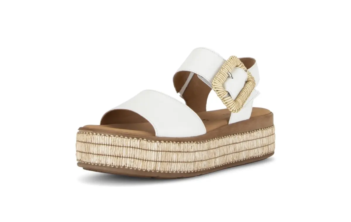 Deze Gabor sandaal van wit nappaleer is een frisse, zomerse blikvanger die elegantie en comfort perfect combineert. De brede leren band voelt soepel aan op de voet en geeft de sandaal een verfijnde uitstraling. De brede enkelband met opvallende, gevlochten gesp zorgt voor een modieuze touch en maakt het mogelijk de pasvorm eenvoudig aan te passen. Dankzij de Best Fitting wijdte F biedt deze sandaal extra ruimte bij de voorvoet, waardoor je voeten ook tijdens warme dagen comfortabel blijven. Het vaste voetbed ondersteunt je voet op natuurlijke wijze en voelt zacht aan bij elke stap. De frisse witte tint laat zich moeiteloos combineren met zomerse jurken, lichte broeken of een casual jeans.