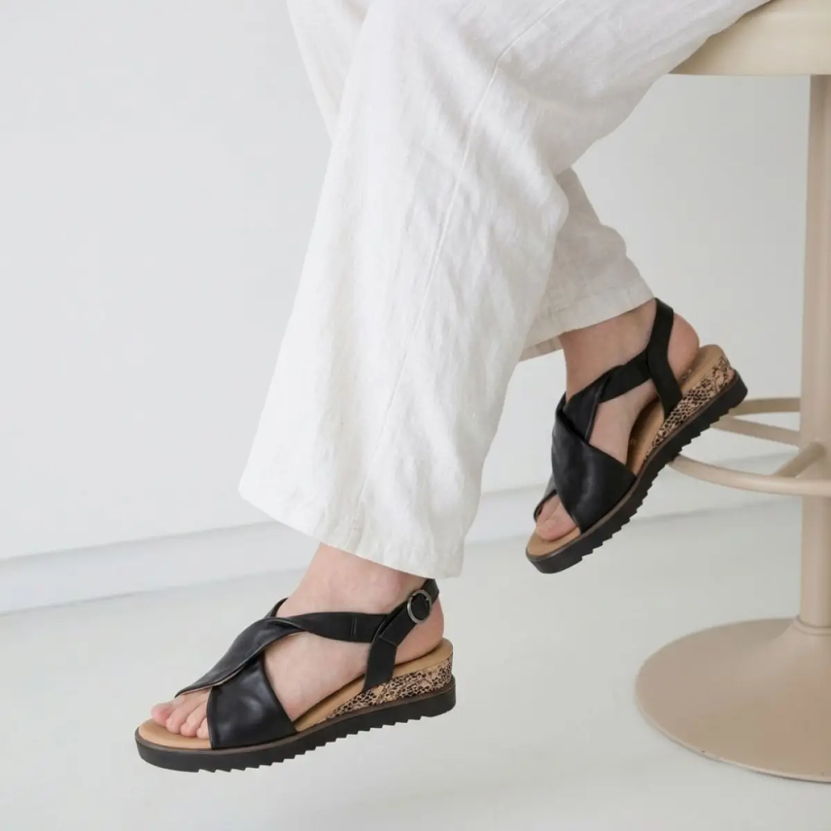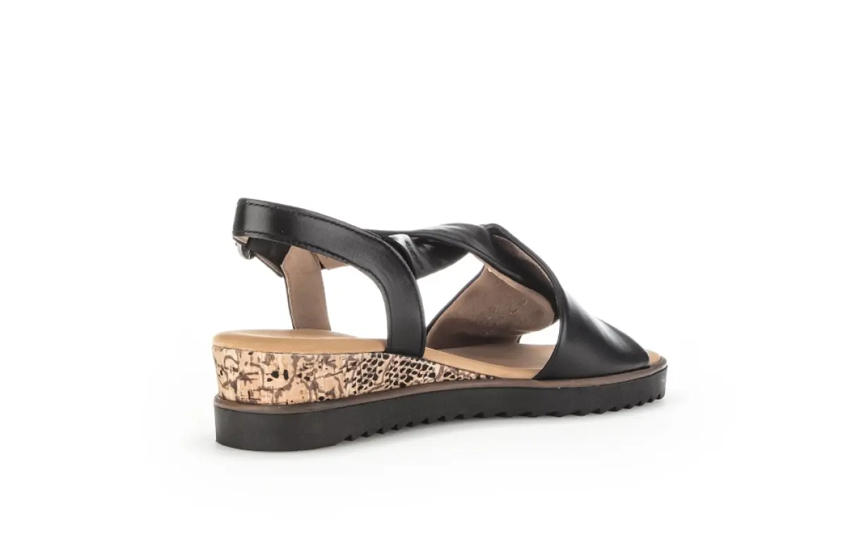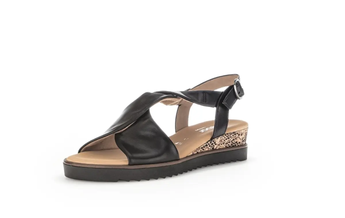 Deze elegante zwarte sandaal van nappaleer van Gabor straalt tijdloze klasse uit met een moderne twist. De soepel gekruiste leren banden voelen zacht aan en sluiten comfortabel om je voet. Het vaste voetbed biedt optimale ondersteuning, waardoor je urenlang zorgeloos kunt lopen. De wijdte G zorgt voor extra ruimte en een ontspannen pasvorm. De zool met subtiele sleehak heeft een speels accent in dierenprint, wat de sandaal een eigentijdse en stijlvolle uitstraling geeft. Combineer deze veelzijdige sandaal met een zomerse jurk, een linnen broek of een elegante rok voor een moeiteloos chique look die comfort en stijl perfect in balans brengt.