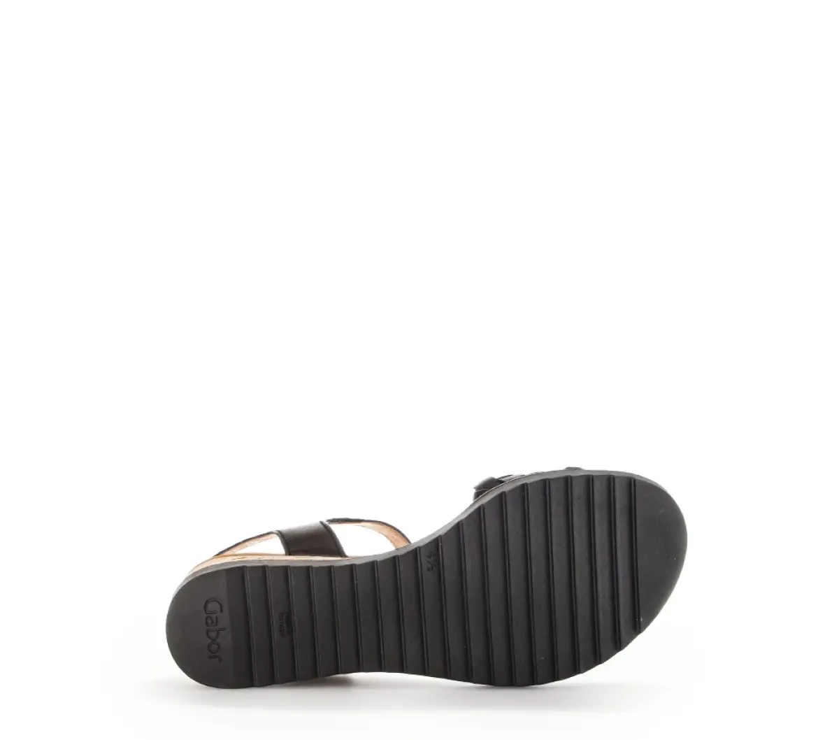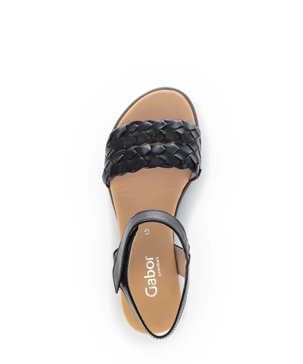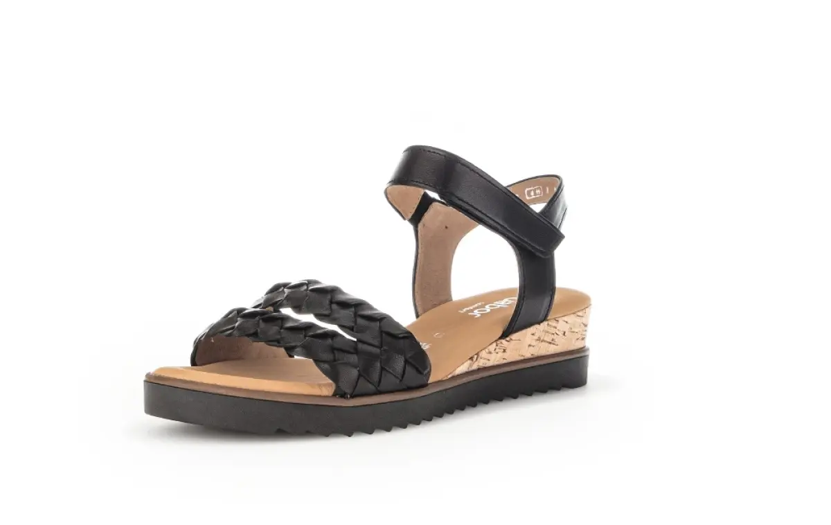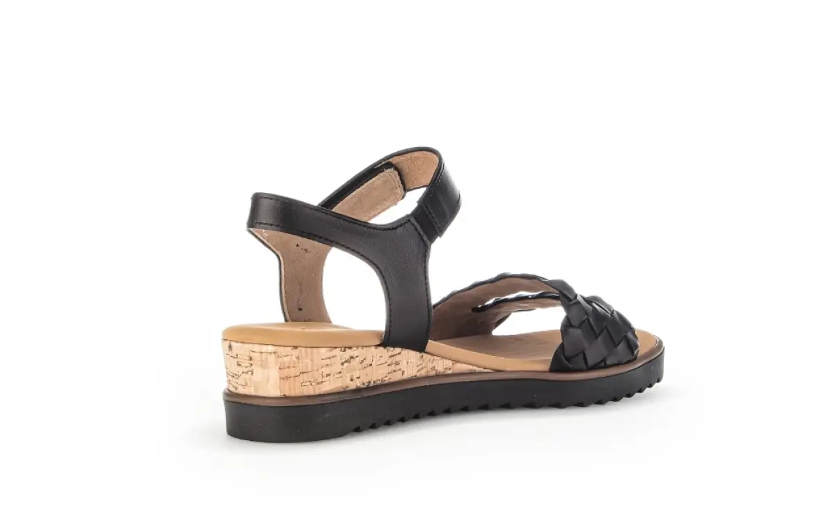 Deze zwarte sandaal van kalfsleer van Gabor is een stijlvolle keuze voor zomerse dagen waarop comfort en elegantie samenkomen. De brede, gevlochten band over de voorvoet geeft een luxueuze en trendy uitstraling, terwijl de enkelband met klittenbandsluiting zorgt voor een stevige en verstelbare pasvorm. Het vaste voetbed biedt uitstekende ondersteuning bij iedere stap, en de wijdte G zorgt voor extra ruimte en draaggemak. De kurklook sleehak voegt een natuurlijke, lichte touch toe, terwijl de zwarte profielzool zorgt voor stabiliteit en grip.