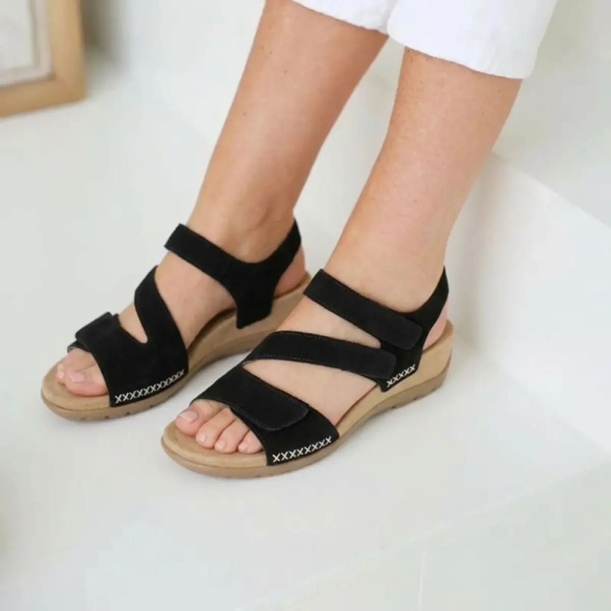 Deze Gabor sandaal van zwart nubuck biedt de perfecte balans tussen comfort en stijl. Het zachte nubuck voelt aangenaam aan en geeft de sandaal een luxe, tijdloze uitstraling. Dankzij de drie verstelbare klittenbandsluitingen pas je de schoen eenvoudig aan voor optimale steun en draaggemak. Het vaste voetbed zorgt voor stabiliteit en langdurig comfort, terwijl de wijdte F (Best Fitting) iets meer ruimte bij de voorvoet biedt voor een natuurlijke pasvorm.
