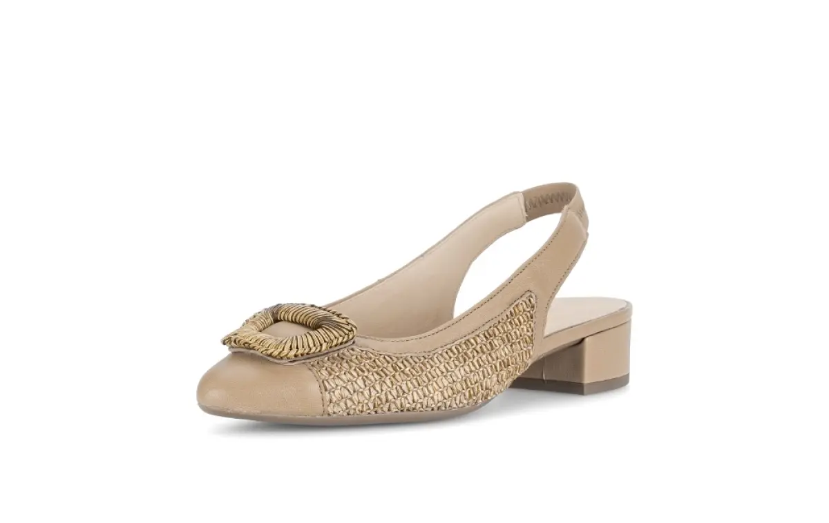 Deze elegante Gabor slingback van beige nappaleer combineert verfijnde details met het comfort waar Gabor om bekendstaat. Het soepele leer voelt zacht aan en vormt zich prachtig naar de voet, terwijl het gevlochten detail aan de zijkant zorgt voor een luchtige, zomerse uitstraling. De decoratieve strik op de neus geeft de schoen een vrouwelijke touch en maakt het geheel stijlvol af. De lage hak van 30 tot 50 mm maakt deze slingback ideaal voor lange dagen of speciale gelegenheden. Het vaste voetbed ondersteunt de voet optimaal, zodat je ook na uren lopen nog steeds kunt genieten van een aangenaam draaggevoel. Deze beige slingback is een tijdloze keuze die elegantie en gemak perfect in balans brengt.