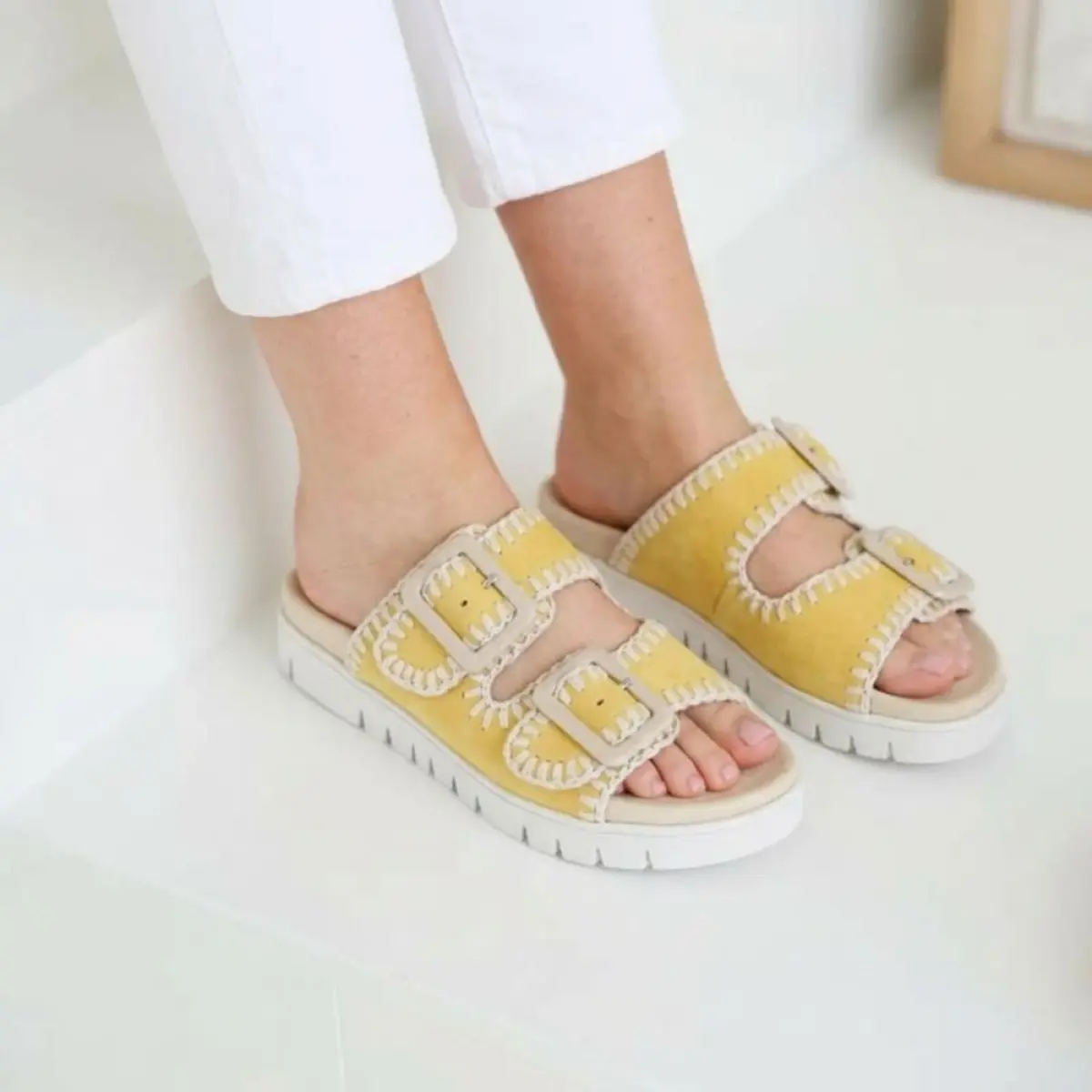 Deze Gabor slipper van geel suède is een echte zomerse blikvanger die comfort en stijl perfect combineert. Het zachte suède voelt prettig aan en de sierlijke stikdetails geven de slipper een unieke, verfijnde uitstraling. Dankzij de twee verstelbare banden met klittenbandsluiting past de schoen eenvoudig aan je voet, wat zorgt voor optimale steun en een persoonlijke pasvorm. Het vaste voetbed biedt stabiel loopcomfort en de wijdte F (Best Fitting) geeft iets meer ruimte bij de voorvoet.