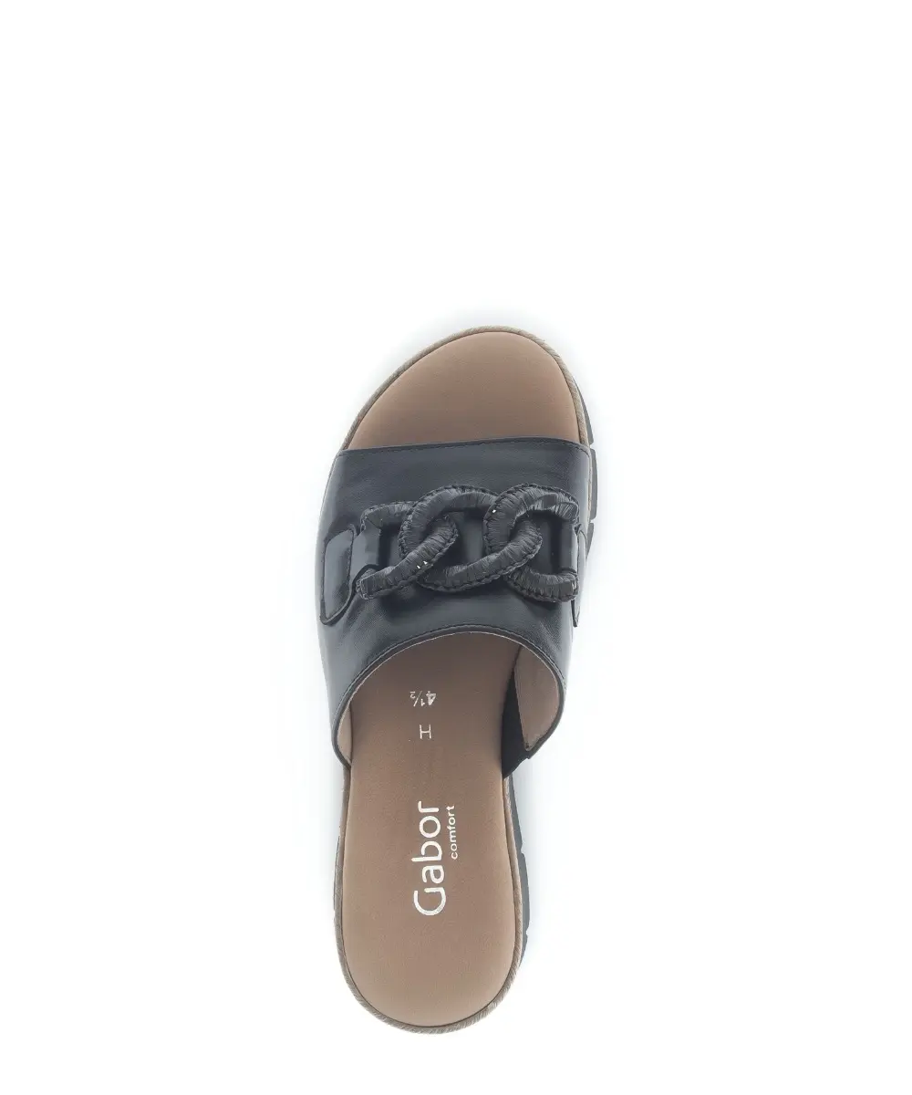 Til je zomeroutfit naar een hoger niveau met deze zwarte slipper van soepel nappaleer. De brede band met stijlvolle ketting geeft een moderne, luxueuze uitstraling. Dankzij de wijdte H is dit model perfect voor de bredere voet en biedt het de hele dag door comfort. Het voetbed voelt zacht aan, terwijl de lichtgewicht zool zorgt voor soepele en stabiele stappen. De gevlochten rand voegt een subtiel detail toe dat perfect past bij een zomerse look. Bestel nu en stap in stijl én comfort het nieuwe seizoen in!
