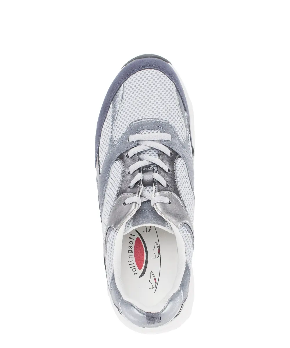 Deze blauwe Gabor sneaker van suède heeft een moderne uitstraling en biedt het comfort dat je van Gabor gewend bent. Het zachte suède in de kleur sky voelt soepel aan en wordt gecombineerd met ademend mesh, waardoor de schoen licht en luchtig aanvoelt tijdens het dragen. Het losse voetbed zorgt voor extra comfort en maakt het mogelijk om eigen inlegzolen te gebruiken. De sportieve zool met subtiele hoogte biedt optimale demping en stabiliteit, ideaal voor dagelijks gebruik. Met wijdte G heeft deze sneaker een fijne pasvorm die geschikt is voor de normale voetbreedte. De elegante blauwe tint en metallic accenten geven de schoen een stijlvolle en eigentijdse look, perfect te combineren met zowel een casual jeans als een zomerse outfit.