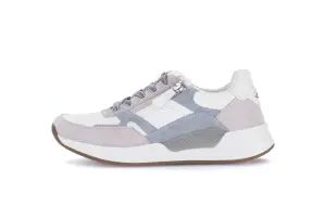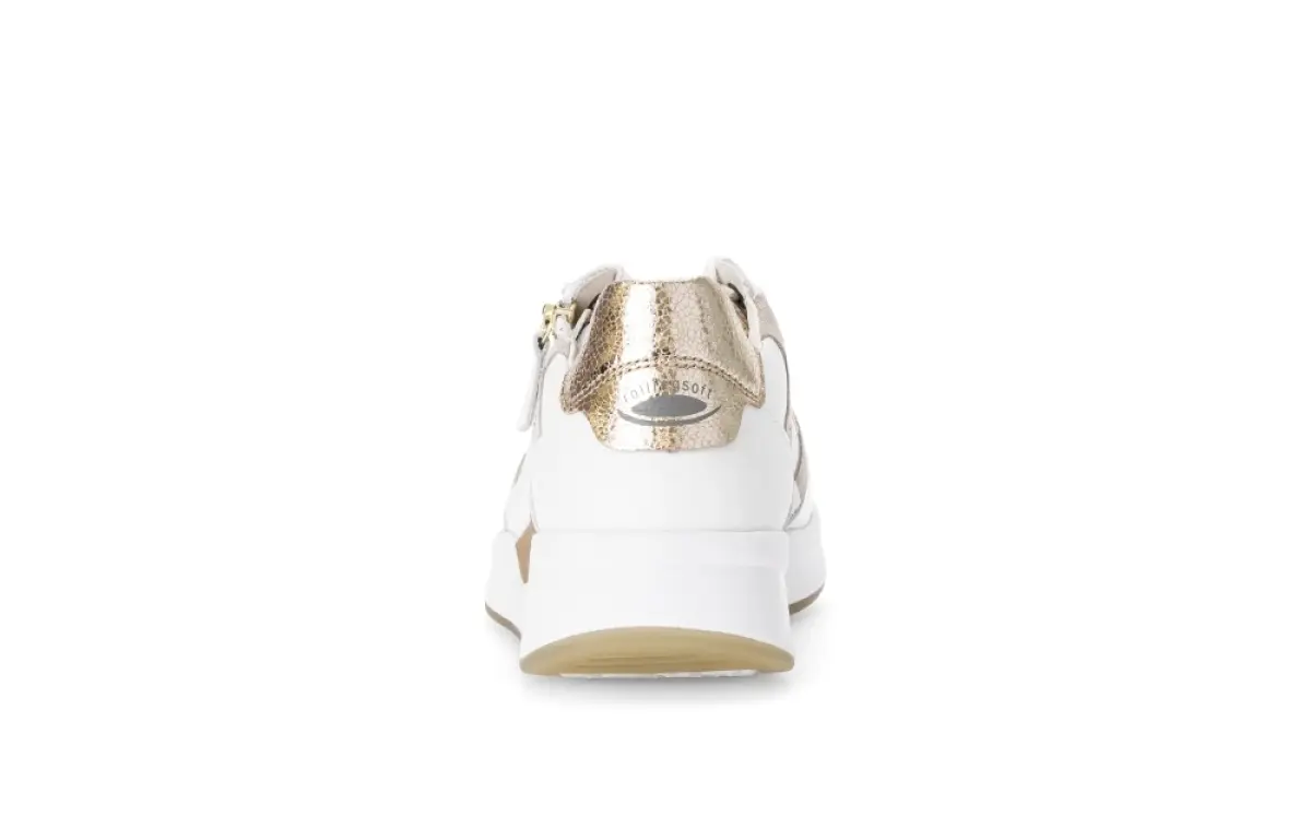 Deze witte sneaker van kalfsleer van Gabor is een moderne klassieker met een sportieve twist. De combinatie van glad wit kalfsleer, zachte beige accenten en een subtiele metallic hiel maakt deze schoen veelzijdig en stijlvol. Dankzij het losse voetbed geniet je van uitstekend comfort en de mogelijkheid om je eigen inlegzolen te gebruiken. De flexibele zool biedt goede demping en ondersteuning, zodat je moeiteloos de hele dag kunt lopen. De wijdte G zorgt voor een comfortabele pasvorm met voldoende ruimte voor de voet, terwijl de rits naast de veters het aan- en uittrekken extra gemakkelijk maakt.