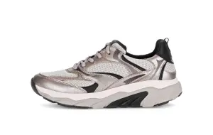 Deze Gabor Rollingsoft sneaker in een metallic zilveren kleur is een echte blikvanger met sportieve flair. De combinatie van mesh en glanzend materiaal geeft de schoen een luchtig en modern karakter. Dankzij de wijdte G en de lichtgewicht zool ervaar je optimale ondersteuning bij elke stap. De uitneembare binnenzool maakt de sneaker geschikt voor eigen steunzolen. Ideaal voor actieve dagen of een citytrip. Draag deze sneaker met een broek of een casual jurk voor een comfortabele en trendy look.