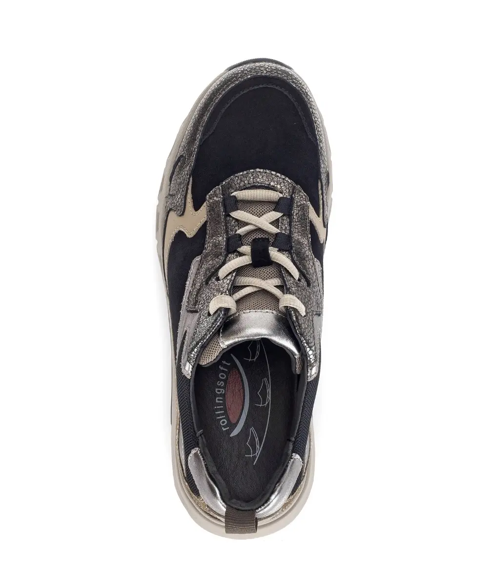 Deze Rollingsoft sneaker van zwart velour in wijdte G combineert sportiviteit met elegantie. Metallic accenten en dynamische lijnen geven de schoen een moderne uitstraling. De lichtgewicht zool met demping en de uitneembare binnenzool bieden optimaal comfort, ideaal voor steunzolen. Perfect voor wie een actieve levensstijl stijlvol wil ondersteunen.