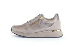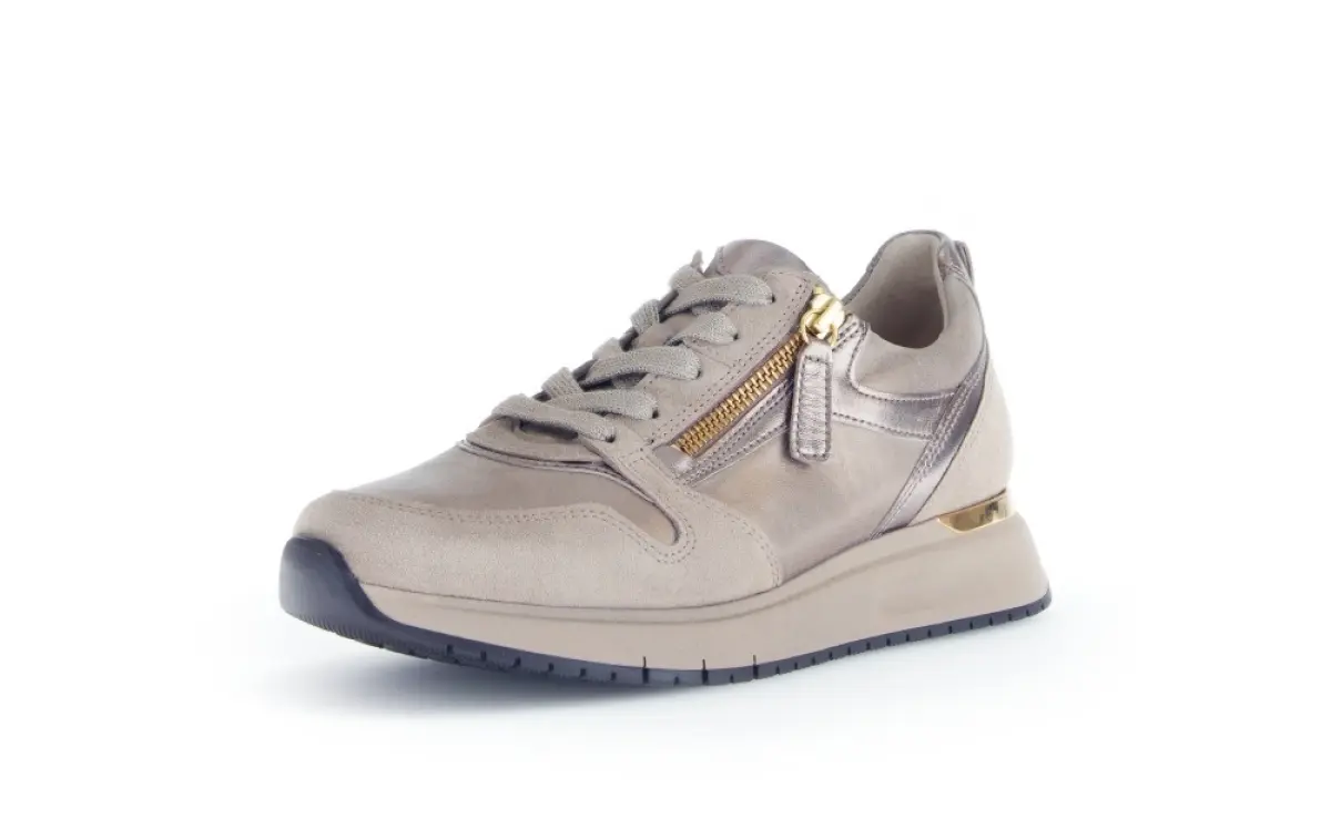 Deze beige sneaker van zacht velour is uitgevoerd in wijdte H, waardoor hij extra ruimte biedt aan bredere voeten. De glanzende metallic details en goudkleurige rits geven de schoen een luxueuze uitstraling, terwijl de stevige zool demping en stabiliteit biedt bij elke stap. De combinatie van veters en ritssluiting zorgt voor zowel een goede pasvorm als gebruiksgemak. De perfecte mix van chic en comfortabel. Ervaar zelf hoe deze sneaker jouw dagelijkse look moeiteloos naar een hoger niveau tilt en bestel nu.