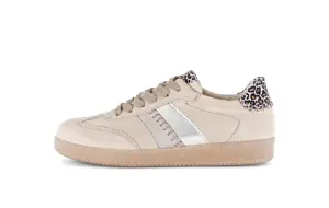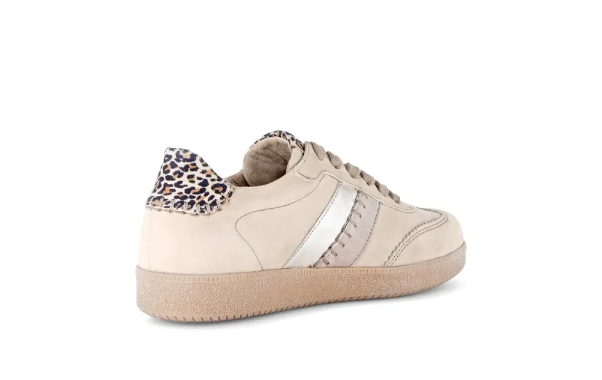 Deze Gabor sneaker van beige suède is een eigentijdse en stijlvolle keuze voor dames die comfort en mode willen combineren. Het zachte suède voelt soepel aan en vormt zich mooi naar de voet, terwijl het subtiele metallic accent aan de zijkant de schoen een moderne en chique uitstraling geeft. De dierenprint op de hiel zorgt voor een speelse twist en maakt deze sneaker extra bijzonder. Dankzij het losse voetbed kun je eenvoudig je eigen inlegzolen gebruiken voor een persoonlijke pasvorm. De wijdte F (Best Fitting) biedt iets meer ruimte bij de voorvoet, waardoor de schoen ook na een lange dag comfortabel blijft. Deze Gabor sneaker is moeiteloos te combineren voor een stijlvolle en moderne look.