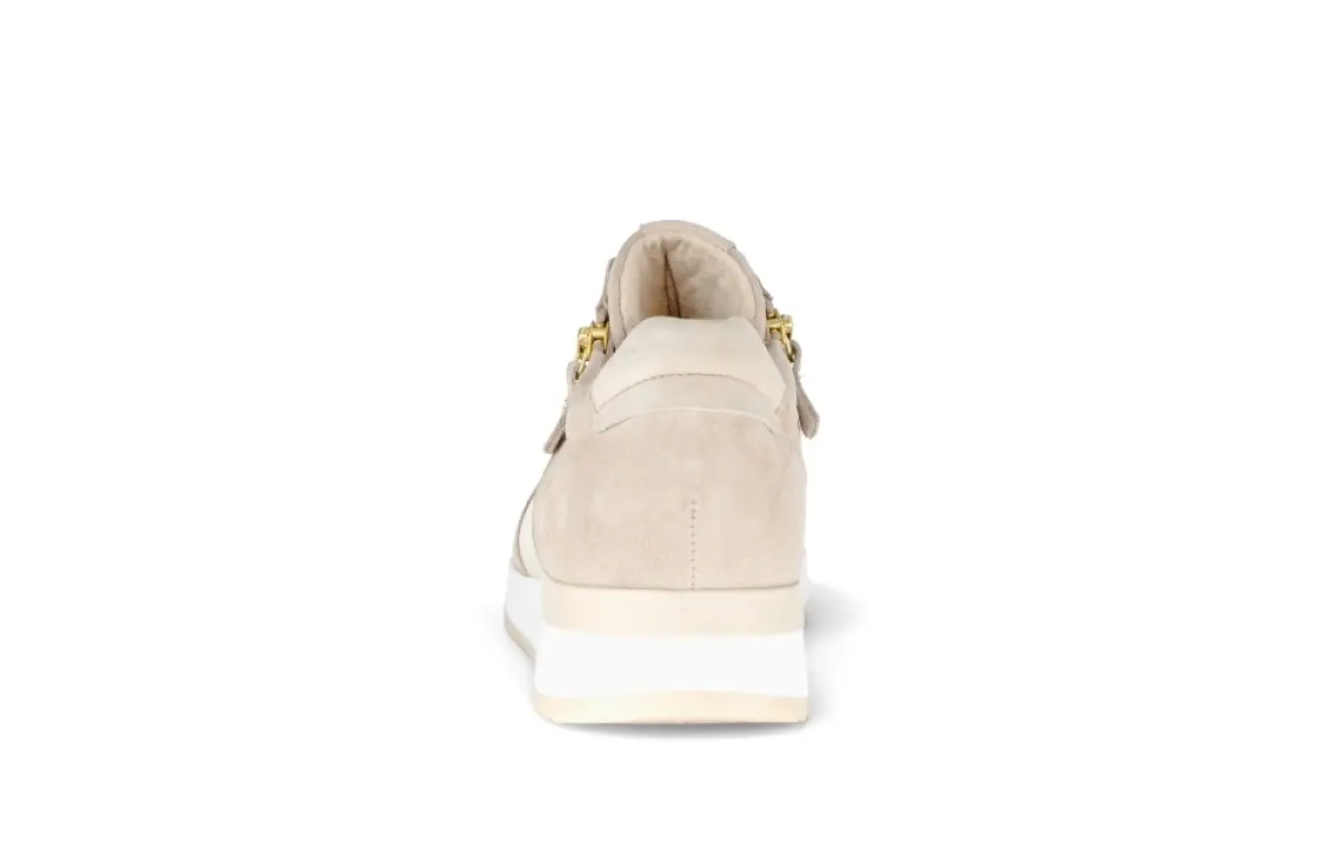 Deze Gabor sneaker van beige veloursleer combineert een moderne uitstraling met het comfort dat je van Gabor gewend bent. Het zachte veloursleer voelt soepel aan en vormt zich prettig naar de voet, terwijl de goudkleurige ritssluiting en lichte zool de schoen een verfijnde, sportieve look geven. Dankzij het losse voetbed kun je eenvoudig je eigen inlegzolen gebruiken voor extra gemak en ondersteuning. De wijdte F (Best Fitting) biedt iets meer ruimte bij de voorvoet, wat zorgt voor een aangename pasvorm. De flexibele zool zorgt voor een natuurlijke afwikkeling van de voet en optimaal loopcomfort. Deze beige Gabor sneaker combineert elegantie, kwaliteit en gemak in één veelzijdig ontwerp