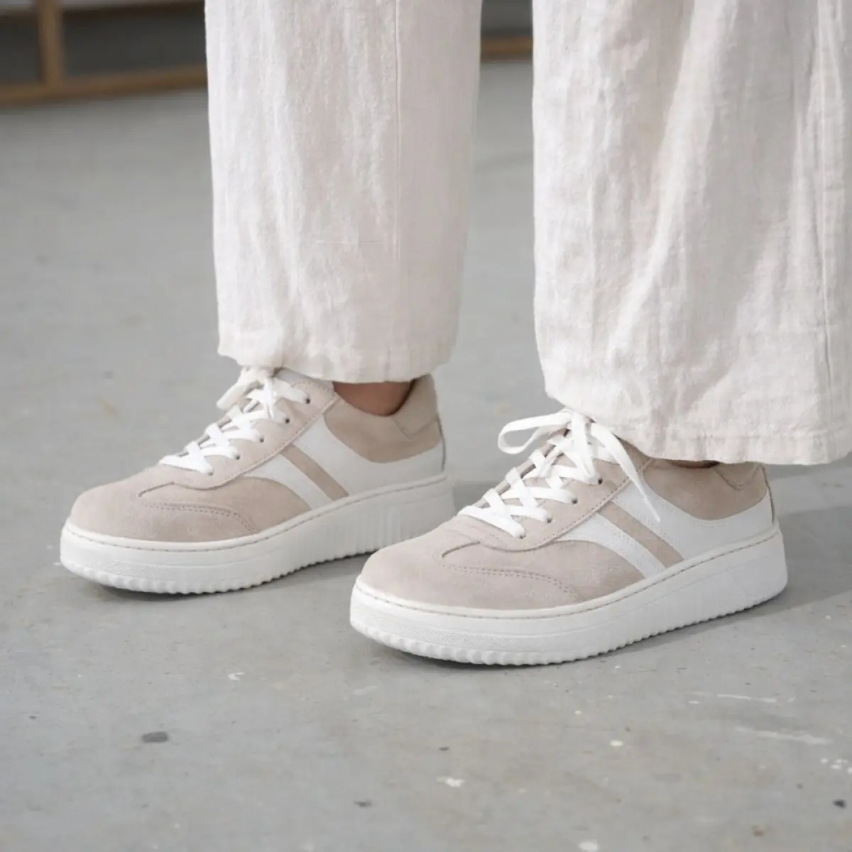 Deze beige sneaker van velour is een stijlvolle en comfortabele keuze voor dagelijks gebruik. Het zachte suède geeft de schoen een luxe uitstraling en voelt soepel aan om de voet. De witte accenten zorgen voor een frisse, moderne look die moeiteloos te combineren is met lichte zomeroutfits of een casual jeans. Dankzij het losse voetbed kun je deze sneaker eenvoudig aanpassen aan je eigen inlegzolen voor extra ondersteuning. De wijdte K biedt extra ruimte, wat zorgt voor een ontspannen pasvorm, zelfs bij bredere voeten. De stevige, lichtgewicht zool biedt een fijne demping en stabiliteit bij elke stap.