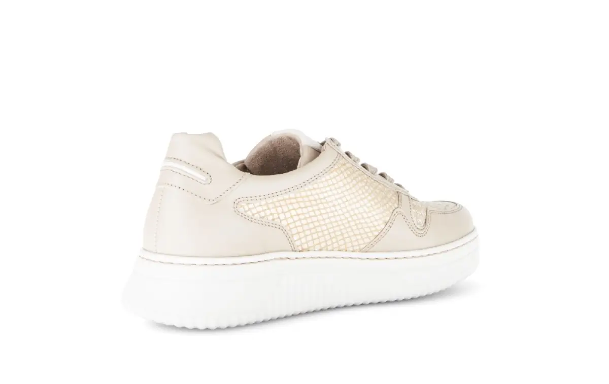 Deze beige Gabor sneaker straalt pure elegantie uit met een moderne, comfortabele twist. Het zachte nappaleer wordt gecombineerd met een subtiel glanzende mesh-structuur die zorgt voor een luchtige en stijlvolle uitstraling. De witte plateauzool geeft de schoen een trendy look en biedt tegelijk uitstekende demping voor langdurig draagcomfort. Dankzij de wijdte K is deze sneaker ideaal voor bredere voeten en biedt hij extra ruimte zonder in te leveren op stijl. Het losse voetbed maakt hem geschikt voor eigen inlegzolen, terwijl de rits aan de zijkant zorgt voor extra gemak bij het aan- en uittrekken.