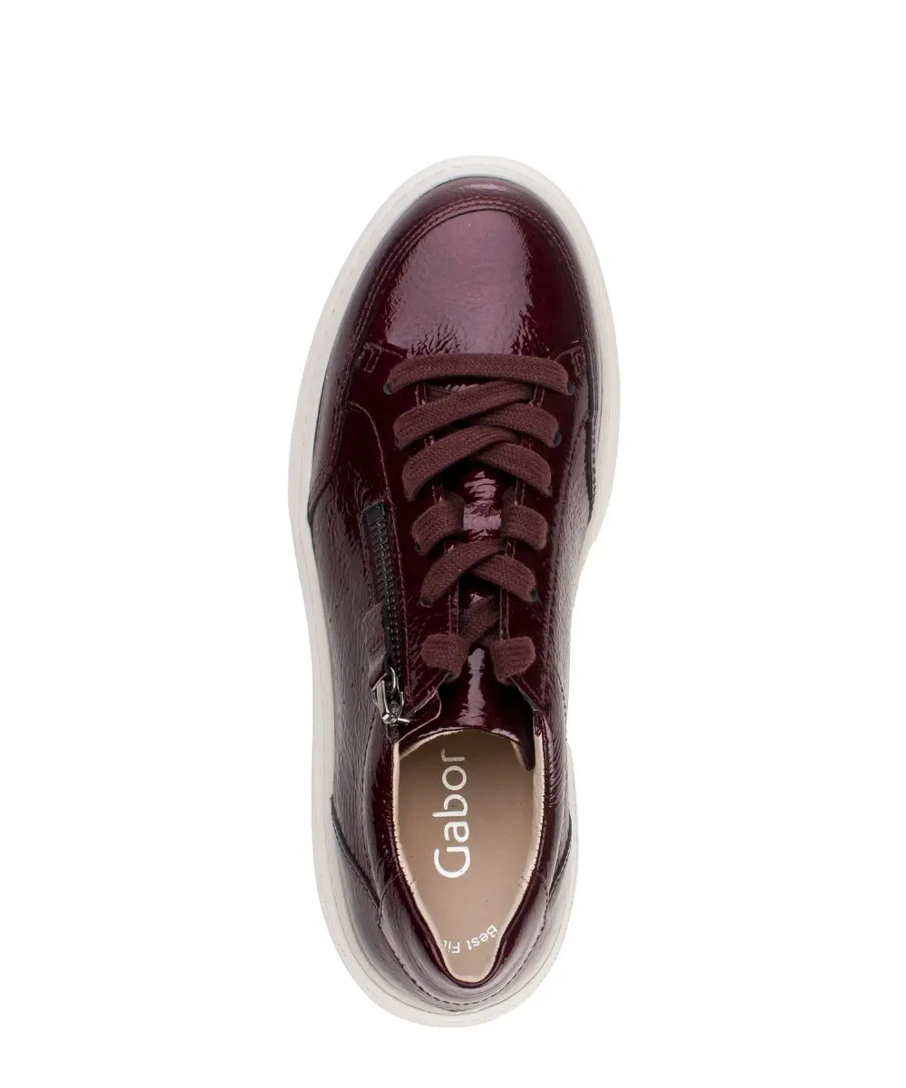 Laat je stijl spreken met deze Gabor sneaker van bordeaux lakleer in wijdte F (Best Fitting). De diepe, glanzende kleur geeft elke outfit een chique touch, terwijl de witte plateauzool zorgt voor een moderne, sportieve uitstraling. Dankzij de rits aan de zijkant trek je de schoen moeiteloos aan en uit. Perfect te combineren met zowel een casual jeans als een nette pantalon. Gun jezelf dit modieuze comfort en bestel vandaag nog jouw nieuwe favoriet.