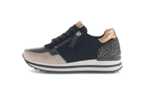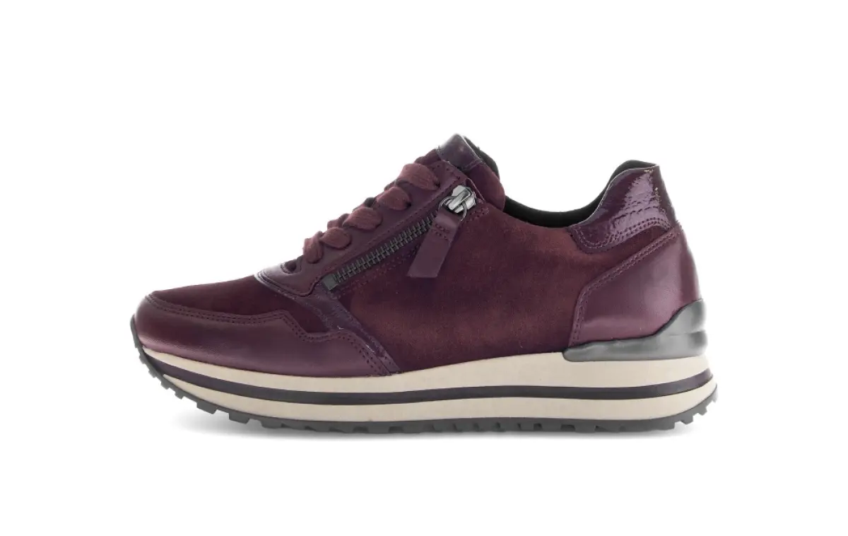Deze bordeaux Gabor sneaker van soepel velour biedt extra ruimte dankzij wijdte H, perfect voor wie nét iets meer comfort zoekt zonder in te leveren op stijl. Het zachte velour voelt zacht aan en oogt warm en elegant, terwijl de lichte zool met subtiele streep zorgt voor een sportieve touch. Dankzij de combinatie van veters en ritssluiting trek je deze schoen makkelijk aan en uit. Het glanzende accent op de hiel geeft de sneaker een stijlvolle touch. Gun je voeten de luxe van comfort en stijl in één en bestel nu jouw nieuwe favoriet.