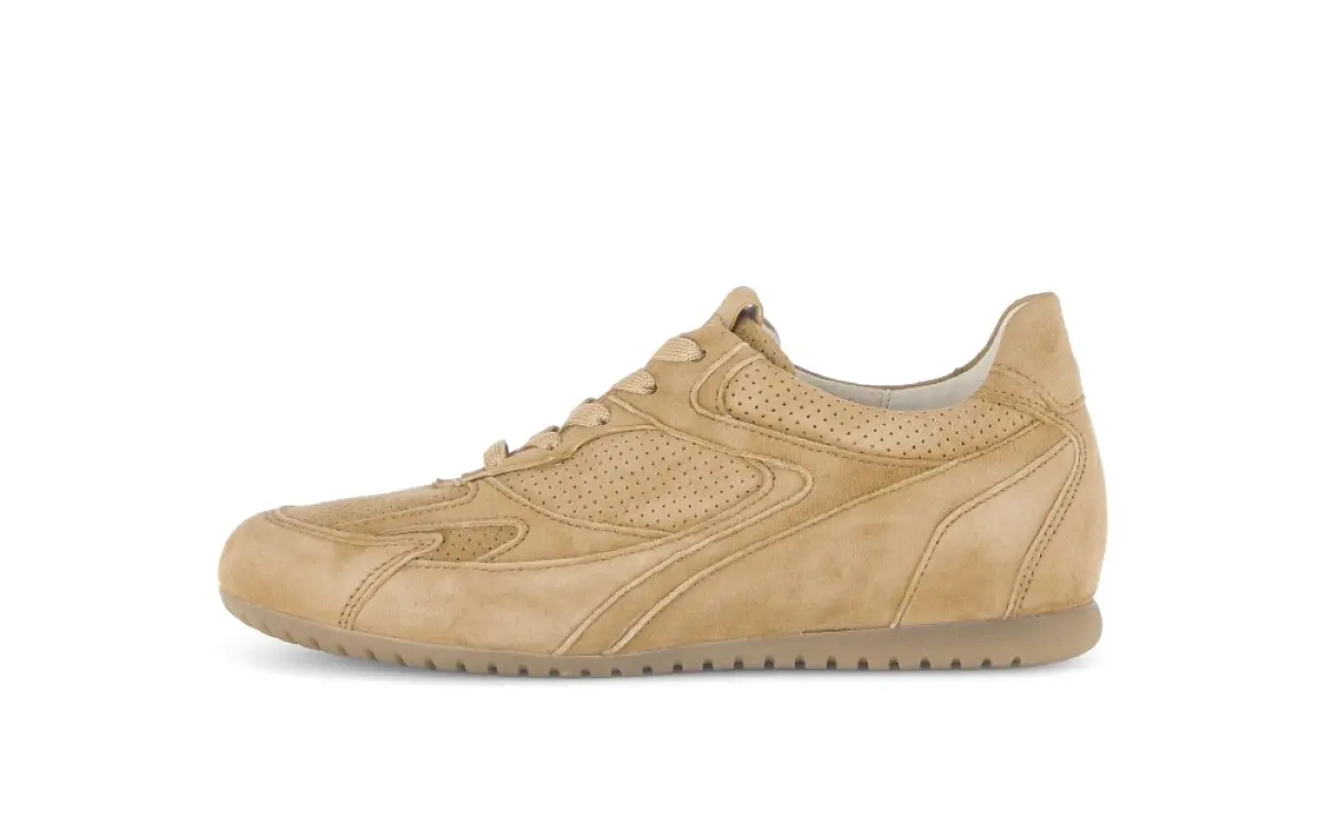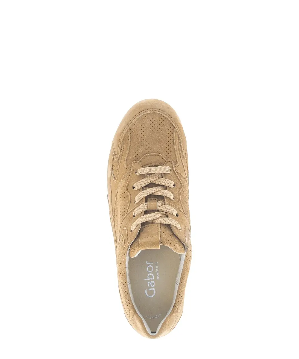 Deze cognackleurige sneaker van suède is een stijlvolle en comfortabele keuze voor dagelijks gebruik. Het soepele suède voelt zacht aan en geeft de schoen een natuurlijke, warme uitstraling, terwijl de fijne perforaties zorgen voor een ademend effect en extra draagcomfort. Dankzij het losse voetbed geniet je van optimale ondersteuning en de mogelijkheid om eigen inlegzolen te gebruiken. De wijdte H biedt wat extra ruimte, ideaal voor wie comfort belangrijk vindt. Deze Gabor sneaker van cognackleurig suède combineert een tijdloze look met modern loopcomfort en is perfect voor een casual- en verzorgde stijl.