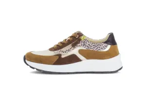 Deze cognackleurige Gabor sneaker van kalfsleer is een echte blikvanger met zijn stijlvolle panterprint en warme bruintinten. De mix van zachte materialen en verfijnde details zorgt voor een luxueuze uitstraling die moeiteloos aansluit bij zowel een casual als een trendy look. De donkere hiel en goudkleurige rits geven de schoen een chique accent, terwijl de lichte zool zorgt voor een modern en luchtig contrast. Het losse voetbed maakt de sneaker geschikt voor eigen inlegzolen, en de wijdte K biedt extra ruimte voor de bredere voet zonder in te boeten op pasvorm of ondersteuning. De dempende zool zorgt voor een comfortabel loopgevoel, ideaal voor lange dagen op pad.