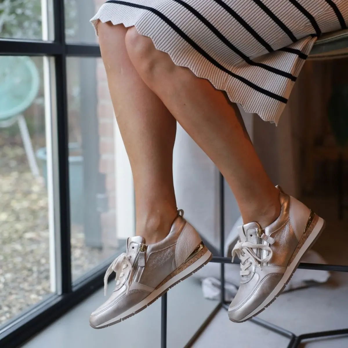 Deze Gabor sneaker van platina nappaleer straalt klasse en comfort uit in één ontwerp. Het glanzende nappaleer geeft de schoen een luxe uitstraling, terwijl de subtiele goudaccenten zorgen voor een stijlvolle en moderne touch. Dankzij de wijdte F (Best Fitting) sluit de sneaker perfect aan op je voet zonder te knellen, waardoor hij ook geschikt is voor iets bredere voeten. Het losse voetbed biedt ondersteuning en maakt het mogelijk om je eigen inlegzolen te gebruiken. De ritssluiting aan de zijkant maakt het aan- en uittrekken extra gemakkelijk, ideaal voor dagelijks gebruik. De platinakleur laat zich moeiteloos combineren met lichte tinten of juist contrasterende kleuren, perfect voor een elegante casual look.