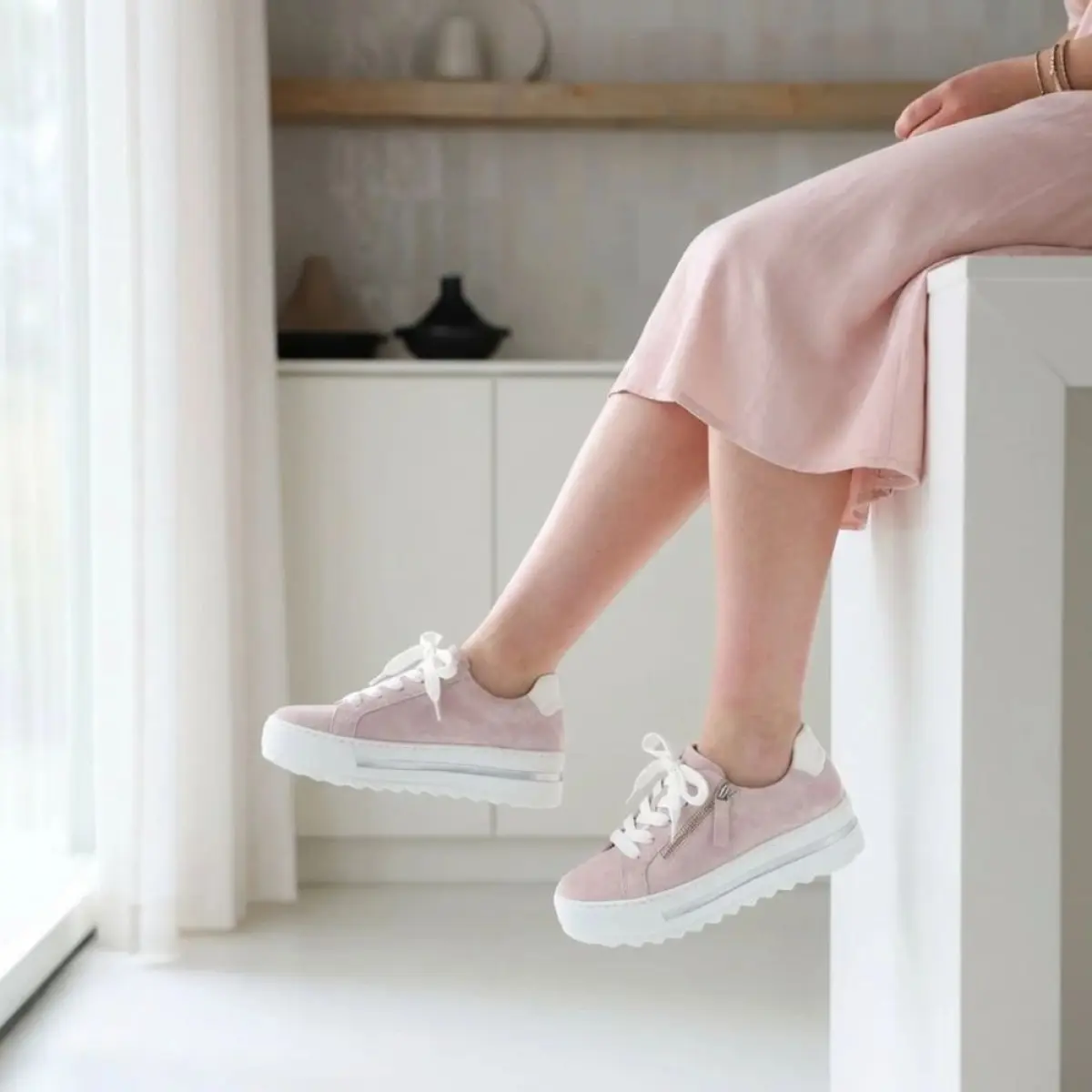 Deze roze sneaker van velour is de perfecte mix van vrouwelijkheid en comfort. Het zachte velour voelt soepel aan en geeft de schoen een luxueuze uitstraling, terwijl de subtiele glans van de lichtroze tint zorgt voor een frisse, zomerse look. Dankzij het losse voetbed kun je je eigen inlegzolen gebruiken, wat extra comfort en ondersteuning biedt tijdens het lopen. De wijdte G zorgt voor een prettige pasvorm bij een gemiddelde voet. De witte plateauzool met zilverkleurige accentstreep geeft de sneaker een moderne, sportieve touch en zorgt voor een subtiele verhoging. De ritssluiting aan de zijkant maakt het aan- en uittrekken snel en eenvoudig. Een ideale sneaker voor wie houdt van stijl, comfort en een vleugje elegantie in het dagelijks leven.