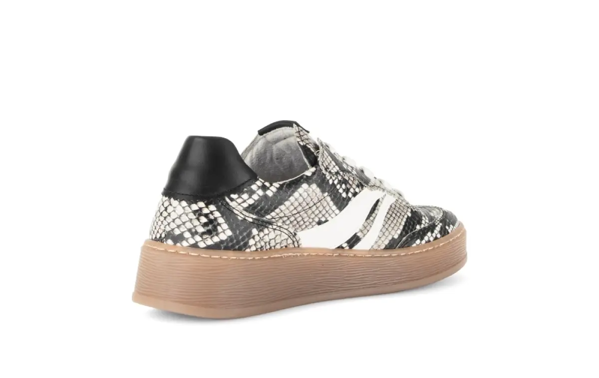 Deze Gabor sneaker met slangenprint in taupe en beige tinten is een echte eyecatcher voor wie van een stijlvolle maar stoere look houdt. Het reliëf in het leer geeft de schoen een luxe uitstraling, terwijl de contrasterende witte accenten en de caramelkleurige zool zorgen voor een moderne, sportieve touch. Het losse voetbed biedt extra comfort en maakt het mogelijk om je eigen inlegzolen te gebruiken. Dankzij de wijdte G sluit de schoen perfect aan bij de gemiddelde voet en ervaar je een natuurlijke pasvorm. De zachte binnenvoering en lichte zool zorgen ervoor dat je moeiteloos de hele dag comfortabel blijft lopen. Combineer deze sneaker met een casual jeans of een modieuze midi-jurk voor een eigentijdse look met karakter.