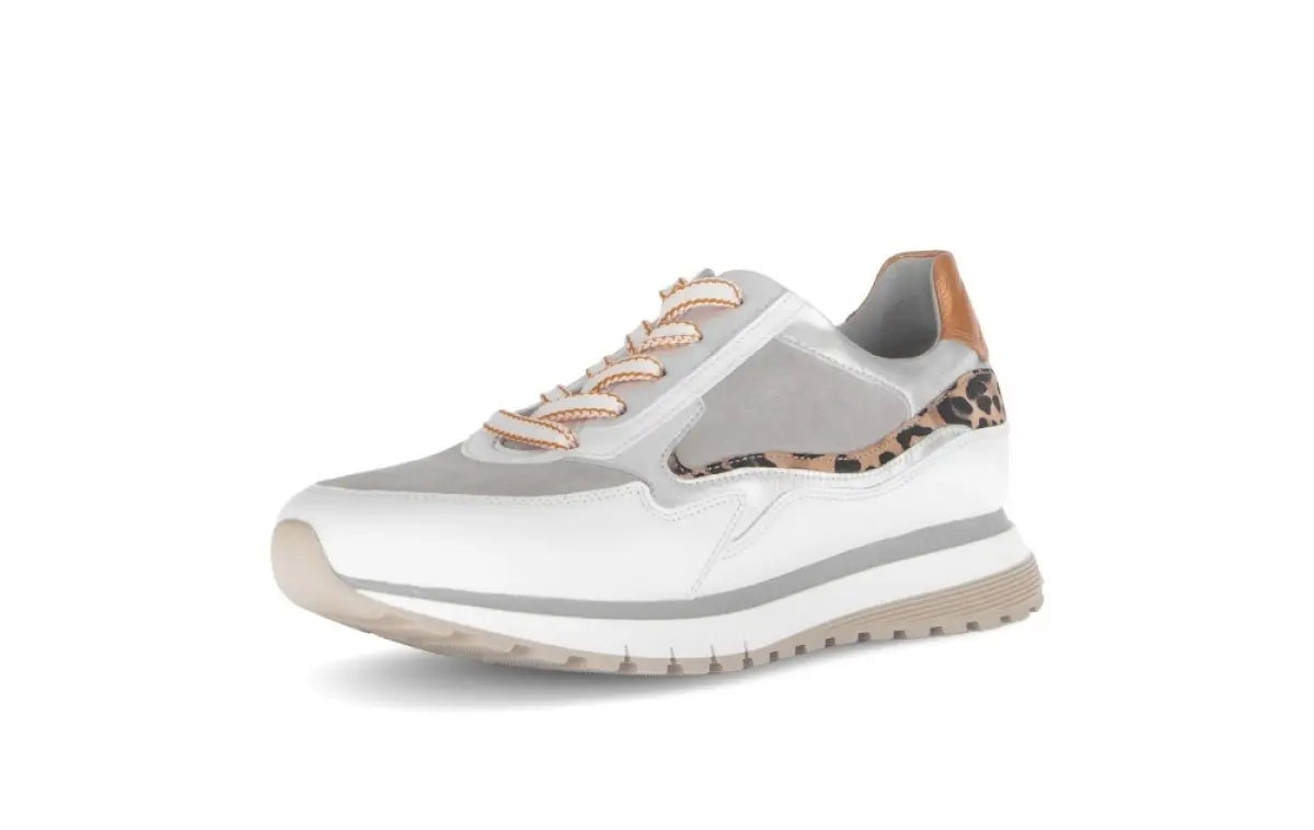 Geef je outfit een stijlvolle upgrade met deze witte sneaker van hoogwaardig nappaleer. De subtiele panterprint en het oranje accent op de hiel voegen een speelse en trendy touch toe. Dankzij de combinatie van soepel leer en suède biedt deze schoen een luxueus gevoel en een comfortabele pasvorm. De lichte zool met grip zorgt voor stabiliteit en demping, ideaal voor lange dagen onderweg. De sierlijke veters en metallic details geven een verfijnde uitstraling. Klanten waarderen de perfecte balans tussen mode en comfort. Bestel nu en ervaar zelf de ultieme mix van stijl en functionaliteit!