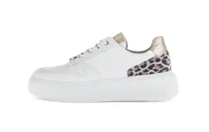 Deze prachtige witte sneaker van Gabor is een must-have voor wie comfort en stijl wil combineren. De witte leren afwerking geeft een frisse, tijdloze look, terwijl de subtiele goudkleurige details en het leopard-patroon op de hiel zorgen voor een speelse twist. De veters met print voegen een trendy touch toe. De verhoogde zool biedt niet alleen extra demping, maar ook een trendy uitstraling. Perfect te combineren met casual en sportieve outfits.