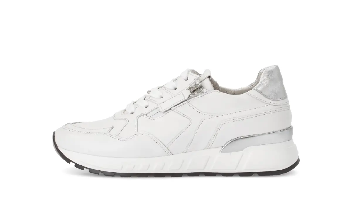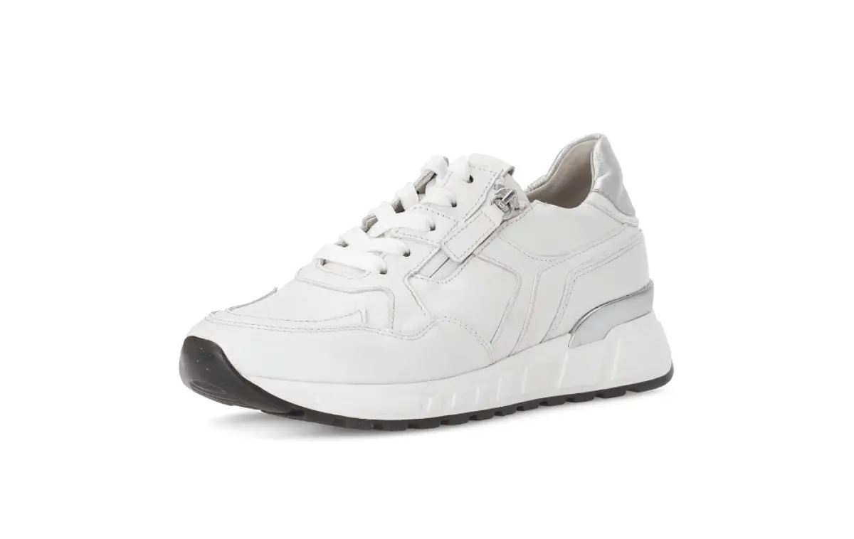 Deze witte sneaker van nappaleer combineert modern design met het comfort dat je van Gabor mag verwachten. Het soepele leer voelt zacht aan en vormt zich prettig naar je voet, terwijl de subtiele metallic accenten aan de hiel zorgen voor een sportieve en vrouwelijke uitstraling. Dankzij het losse voetbed kun je de sneaker eenvoudig dragen met je eigen steunzolen, wat hem extra praktisch maakt. De wijdte H biedt meer ruimte voor de bredere voet, zonder in te leveren op elegantie. De stevige zool met lichte verhoging zorgt voor stabiliteit en demping, waardoor elke stap aangenaam aanvoelt. Met de combinatie van een ritssluiting en veters trek je de schoen makkelijk aan en uit, terwijl de pasvorm optimaal blijft. Deze witte Gabor sneaker is een tijdloze essential die moeiteloos past bij elke garderobe en elke gelegenheid.