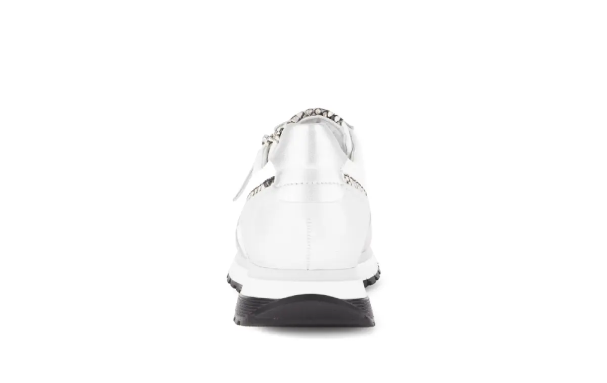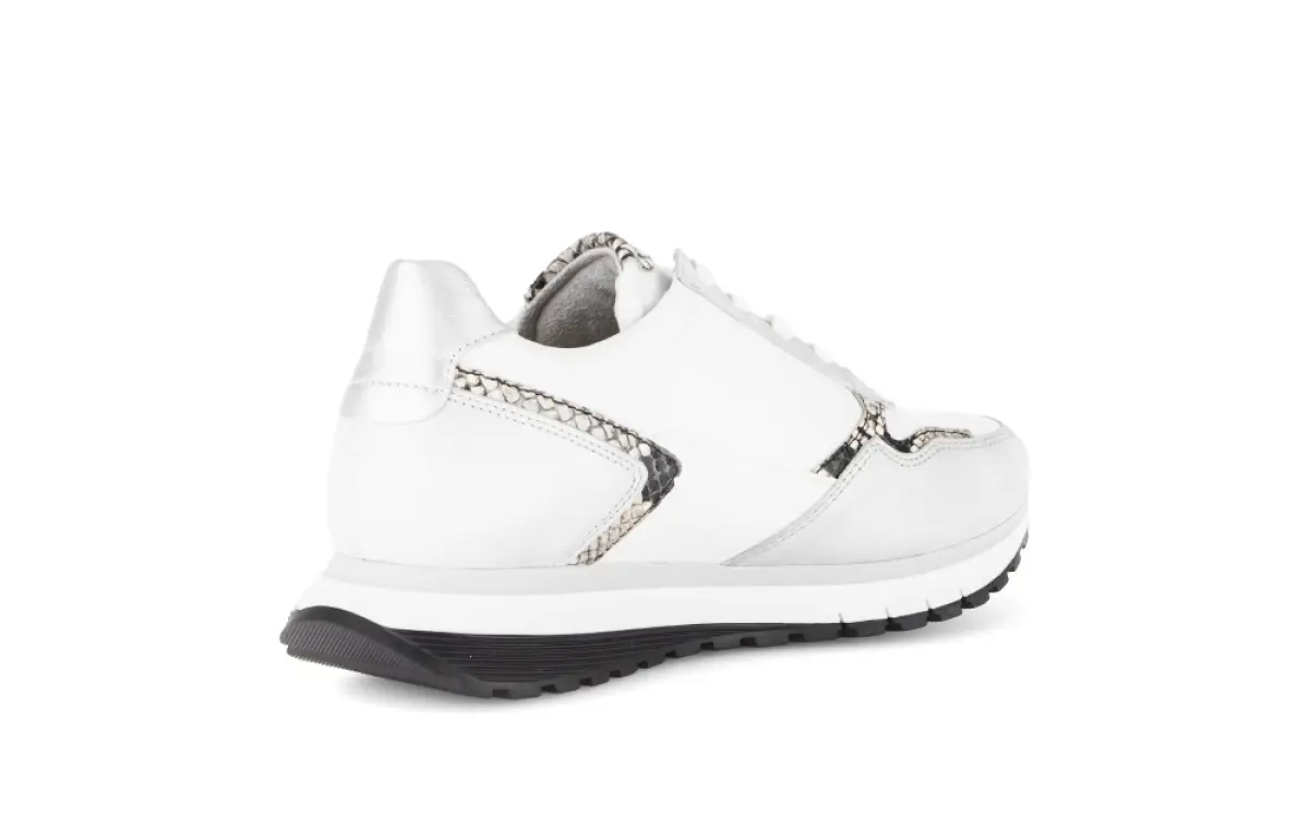 Deze witte sneaker van Gabor combineert sportieve elegantie met verfijnde details. Het soepele nappaleer voelt zacht aan en krijgt een moderne uitstraling door de subtiele slangenprintaccenten en metallic zilverkleurige afwerking. De zwarte zool zorgt voor een stijlvol contrast en geeft de schoen een eigentijdse, modieuze look. De wijdte H biedt extra ruimte en comfort, ideaal voor iets bredere voeten. Het losse voetbed maakt de sneaker geschikt voor eigen inlegzolen. De lichte zool met goede demping zorgt ervoor dat je moeiteloos en comfortabel loopt, de hele dag door. Perfect te combineren met een jeans of een sportieve jurk, deze sneaker geeft elke outfit een frisse, luxe uitstraling.