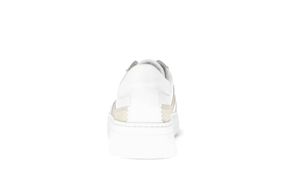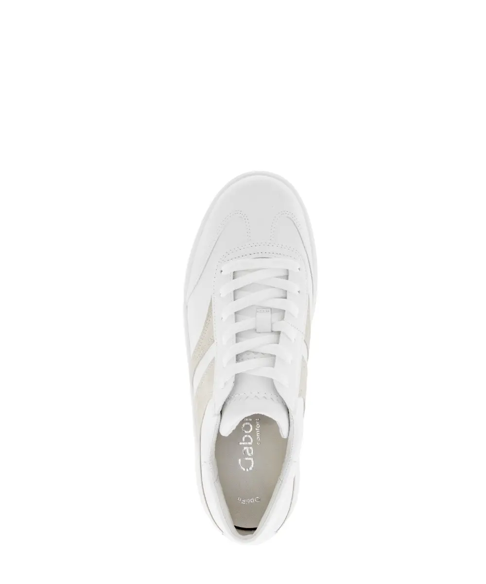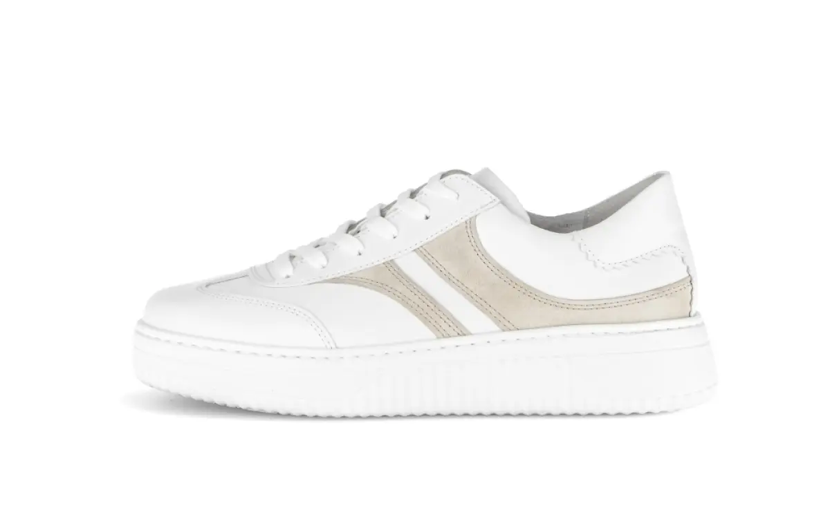 Deze witte Gabor sneaker combineert een sportieve uitstraling met verfijnde details. Het gladde nappaleer voelt zacht en soepel aan, terwijl de subtiele beige suèdedetails langs de zijkant zorgen voor een frisse en stijlvolle touch. De stevige plateauzool geeft de schoen een moderne look en biedt tegelijkertijd extra comfort en stabiliteit. Dankzij de wijdte K heeft deze sneaker een royale pasvorm, ideaal voor wie wat meer ruimte aan de voorvoet nodig heeft. Het losse voetbed maakt het mogelijk om eigen inlegzolen te gebruiken, en de lichte zool zorgt voor optimale demping bij elke stap.