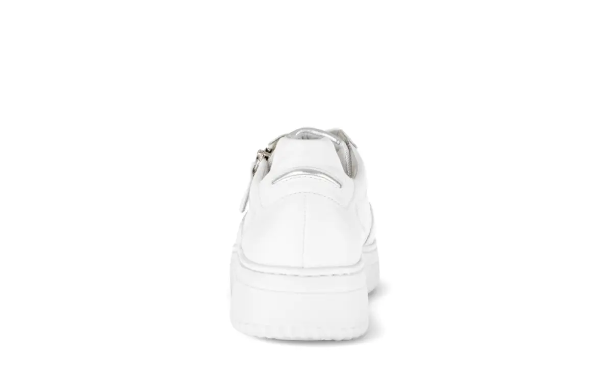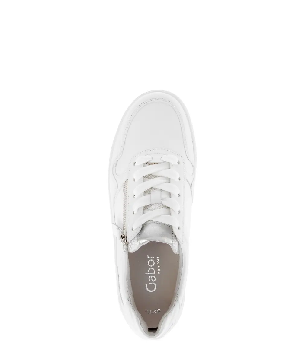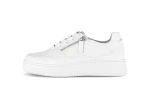 Deze witte sneaker van nappaleer is een tijdloze klassieker met een moderne twist. Het gladde leer voelt zacht aan en geeft de schoen een luxueuze uitstraling, terwijl de subtiele details en de zilverkleurige rits zorgen voor extra gemak bij het aan- en uittrekken. Dankzij het losse voetbed kun je eenvoudig je eigen inlegzolen gebruiken, wat het draagcomfort verhoogt. De wijdte K biedt extra ruimte en is ideaal voor wie graag wat meer bewegingsvrijheid heeft. De robuuste witte zool zorgt voor een sportieve look én voor optimale demping bij elke stap. Deze Gabor sneaker combineert perfect voor dagelijks gebruik of een stijlvolle casual outfit.