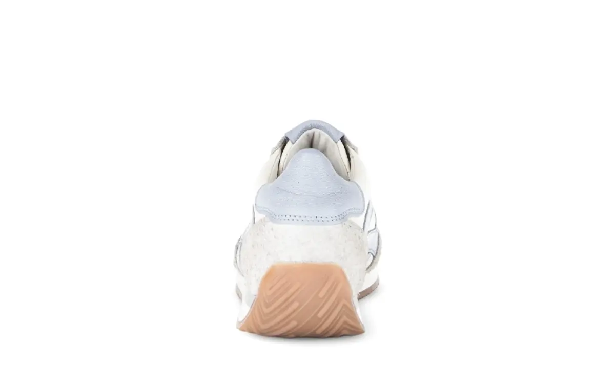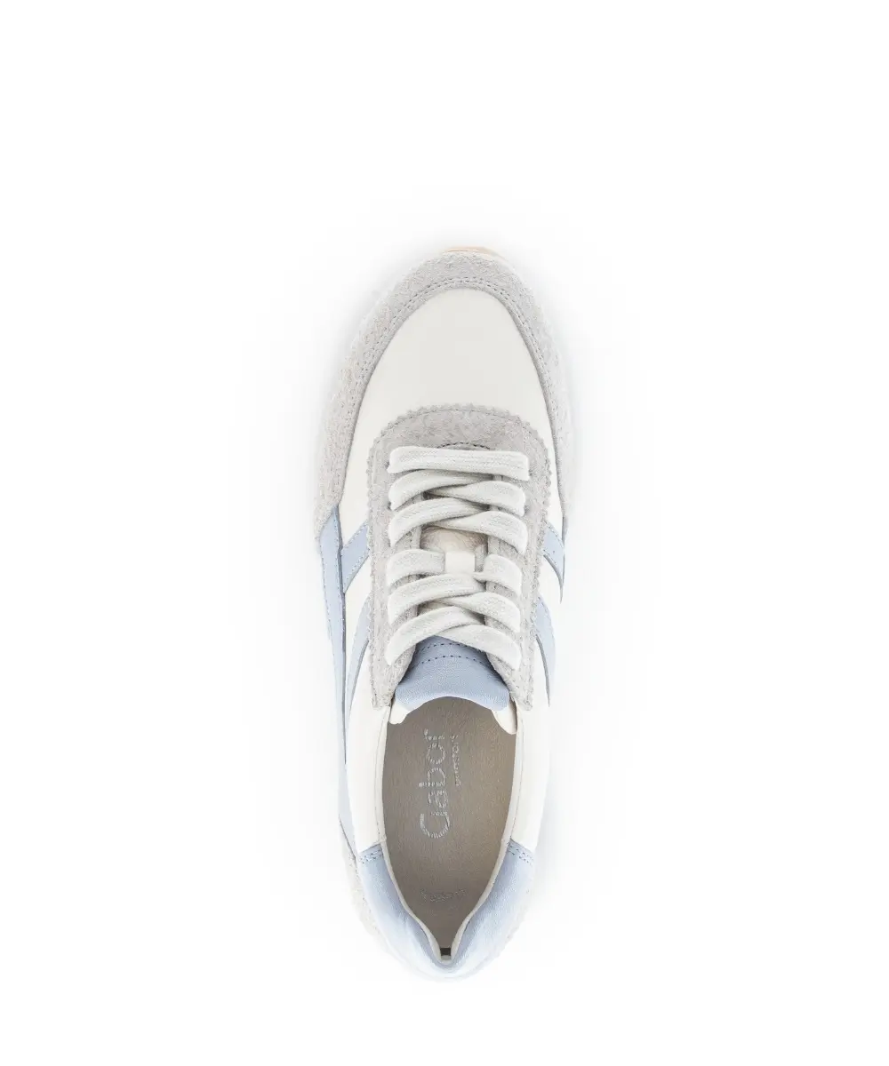 Deze witte Gabor sneaker van kalfsleer is een frisse en sportieve keuze voor elke dag. De combinatie van wit met lichtblauwe details geeft de schoen een moderne, zomerse uitstraling. Het gladde leer voelt soepel aan en zorgt voor een luxueuze afwerking, terwijl de suède accenten een zachte, natuurlijke touch toevoegen. Het losse voetbed biedt optimaal comfort en maakt het mogelijk om eigen inlegzolen te gebruiken. Dankzij de wijdte H heeft de schoen een iets ruimere pasvorm, ideaal voor wie extra bewegingsvrijheid wenst. De lichte zool met goede grip zorgt voor stabiliteit en loopgemak, zowel tijdens een dag winkelen als een ontspannen wandeling.