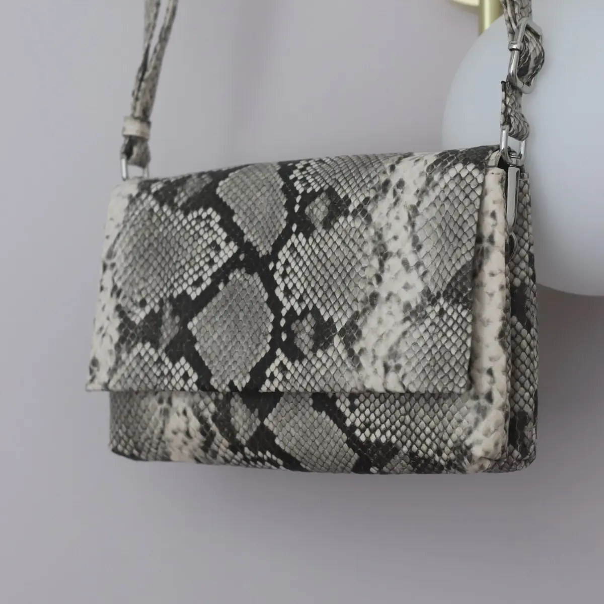 Ben je op zoek naar een tas die direct je look versterkt en tegelijk praktisch blijft? Deze Gabor schoudertas in antraciet met een grijze slangenprint geeft elke outfit meteen meer karakter. Het compacte ontwerp van 23 x 14 x 4,5 cm voelt licht en handig aan, precies goed voor je dagelijkse essentials. Wanneer je de klep opent, zie je hoe de tas overzicht biedt met twee ruime vakken en een veilig ritsvak. De structuur van het materiaal voelt zacht maar stevig aan en de print geeft een stijlvolle twist zonder te overheersen. De verstelbare schouderriem zorgt ervoor dat je de tas precies op jouw lengte draagt, zodat je altijd comfortabel onderweg bent. Dankzij het ritsvak aan de achterkant heb je extra opbergruimte die je meteen bij de hand hebt. Deze tas past moeiteloos bij zowel rustige tinten als bij een opvallende outfit.