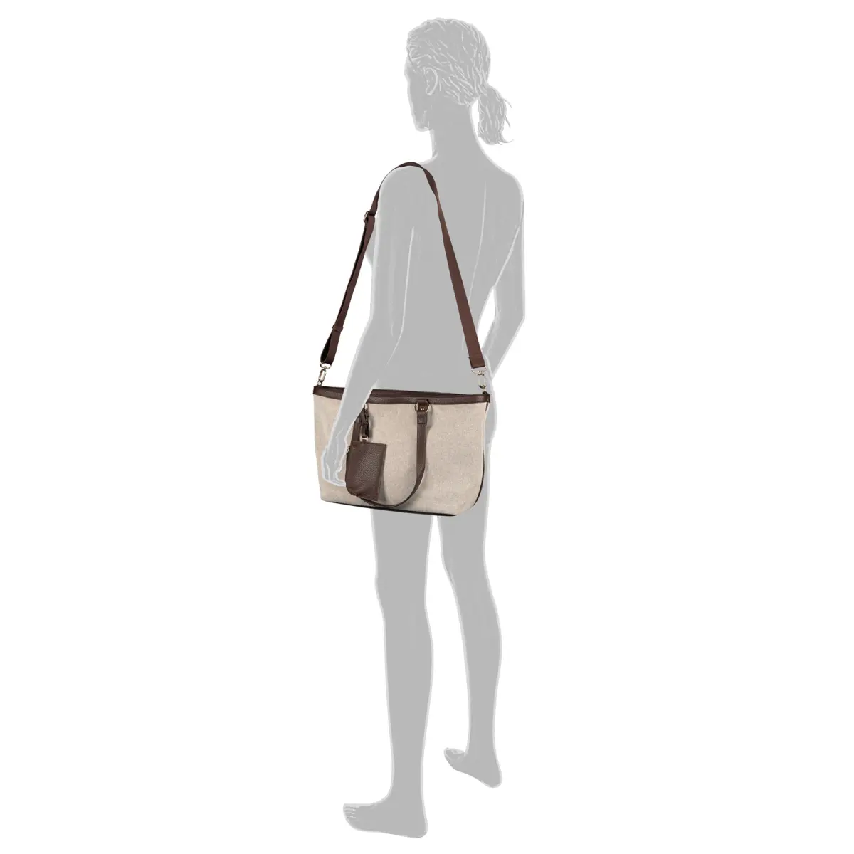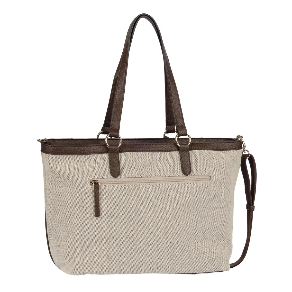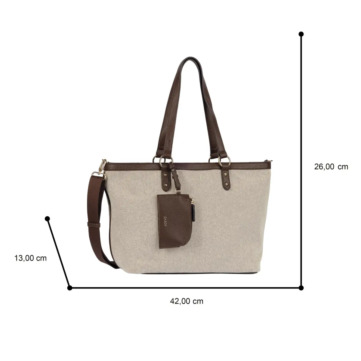 Deze beige Gabor tas is perfect wanneer je zoekt naar een elegante, ruime en gebruiksvriendelijke tas voor dagelijks gemak. Dankzij het formaat van 42 x 26 x 13 cm heb je altijd voldoende plek voor je essentials, zonder dat de tas zwaar of onhandig aanvoelt. Het combinatie-materiaal met beige canvas en donkerbruine accenten geeft de tas een moderne en stijlvolle uitstraling die je moeiteloos combineert met je dagelijkse outfits. Wanneer je de tas opent, zie je direct hoe overzichtelijk alles is ingedeeld. Het hoofdvak sluit met een rits en biedt meerdere binnenvakken voor je telefoon, sleutels en kleine items. Aan de achterkant zit een extra ritsvak, ideaal voor spullen die je snel bij de hand wilt hebben. De afneembare schouderband zorgt ervoor dat je de tas zowel handmatig als crossbody kunt dragen, afhankelijk van wat jij prettig vindt. Comfort, kwaliteit en stijl komen samen in één model dat je iedere dag met plezier meeneemt.