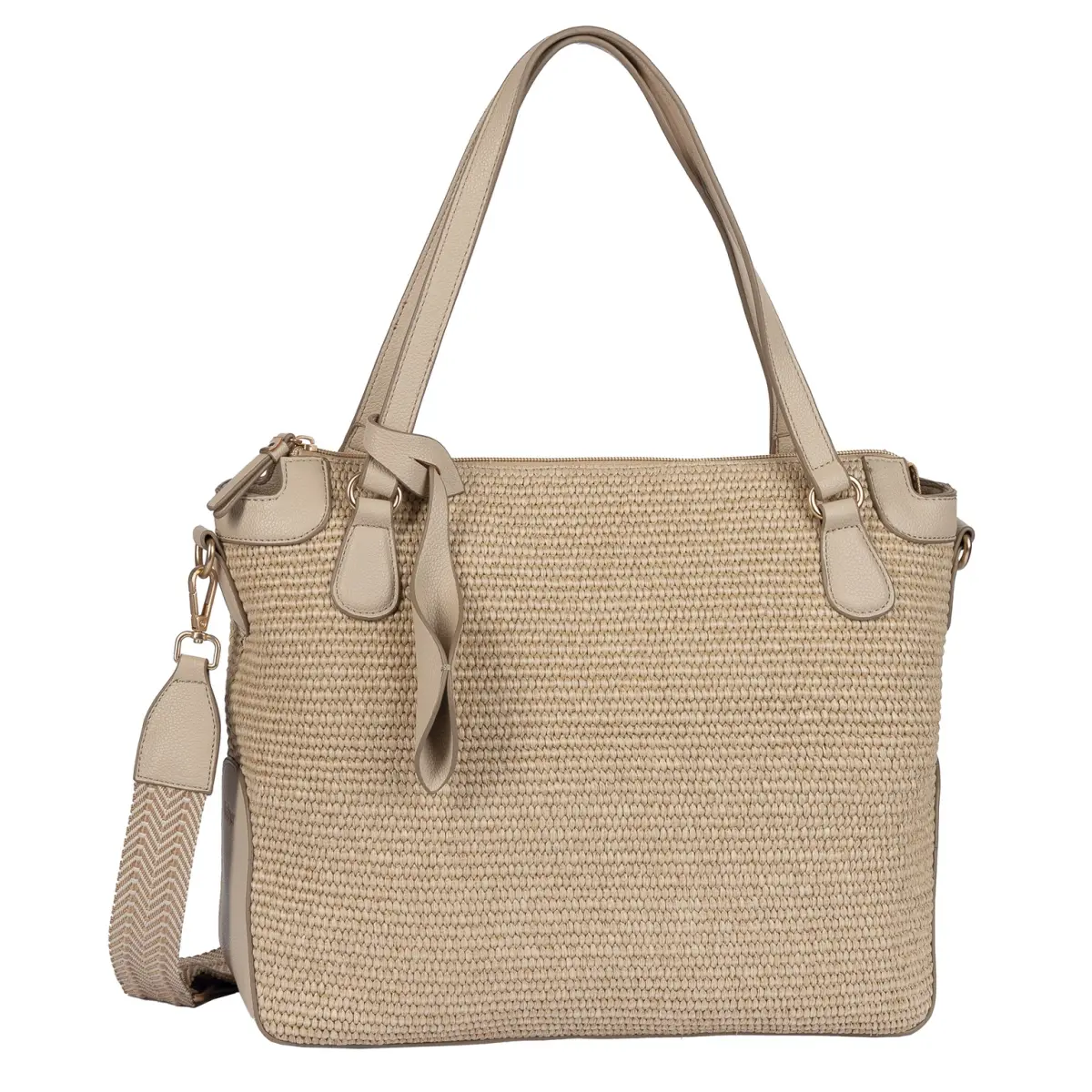 Deze ruime Gabor tas in beige is perfect wanneer je graag alles georganiseerd meeneemt zonder in te leveren op stijl. Het geweven materiaal geeft de tas een natuurlijke, zomerse uitstraling, terwijl de beige afwerking zorgt voor een rustige en tijdloze look die moeiteloos combineert met jouw dagelijkse outfits. Met een formaat van 36 x 29 x 12 cm biedt deze tas verrassend veel ruimte. Het grote hoofdvak sluit met een rits en bevat meerdere binnenvakjes, zodat je belangrijke items zoals je telefoon, sleutels en portemonnee snel terugvindt. Aan de achterzijde zit een extra ritsvak voor kleine spullen die je graag binnen handbereik hebt. Je draagt de tas comfortabel in de hand dankzij de stevige hengsels, of je kiest voor de afneembare en verstelbare schouderriem om hem crossbody of over de schouder te dragen. De combinatie van functionaliteit en elegantie maakt dit een ideale tas voor werk, winkelen of een dagje uit.