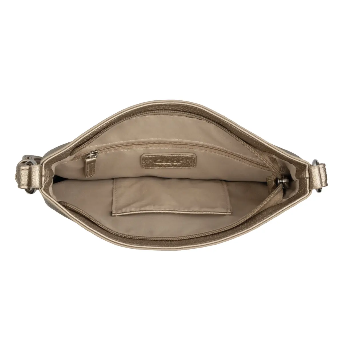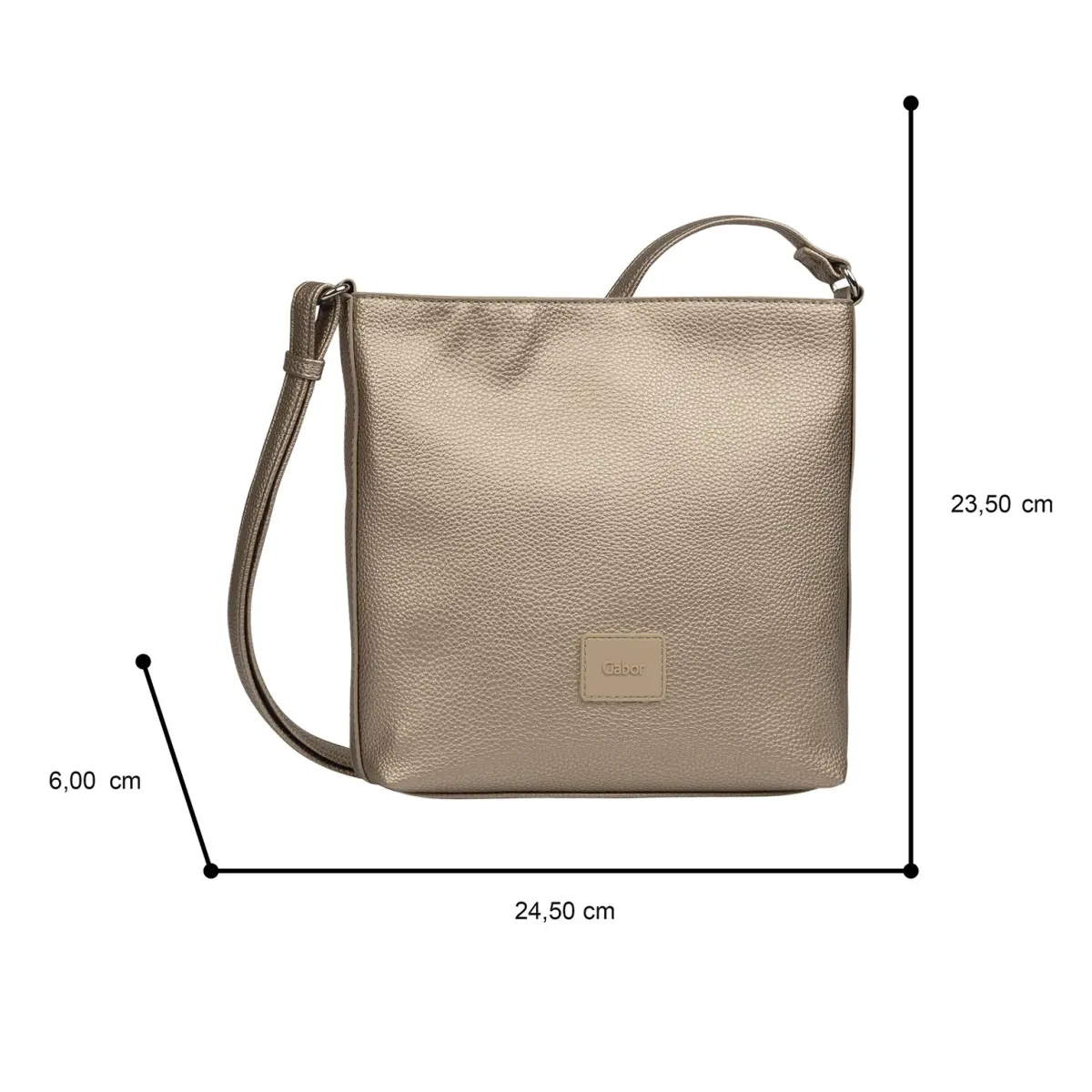 Deze Gabor tas in de kleur brons is een stijlvolle essential die moeiteloos past bij zowel je dagelijkse outfits als je meer geklede looks. Dankzij het compacte, praktische formaat van 24,5 x 23,5 x 6 cm neem je al je belangrijkste spullen georganiseerd mee, zonder dat de tas te groot of zwaar voelt. De tas heeft een hoofdvak met ritssluiting, een ritsvak aan de achterkant en meerdere binnenvakjes voor je sleutels, telefoon en andere essentials. De fijne structuur van het materiaal geeft de tas een luxueuze uitstraling, terwijl de bronzen tint zorgt voor een moderne, tijdloze touch. De verstelbare schouderriem maakt het mogelijk om de tas comfortabel crossbody of over de schouder te dragen, precies zoals jij dat prettig vindt. Of je nu een dagje gaat shoppen, naar je werk gaat of een avondje uit plant, deze Gabor tas biedt het perfecte evenwicht tussen elegantie en gemak.